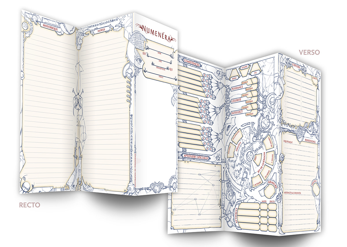 Et oui, la feuille de personnage de Numenéra se plie en 3, ce qui en fait un objet discret, peu emcombrant et light. Sympa, non ?