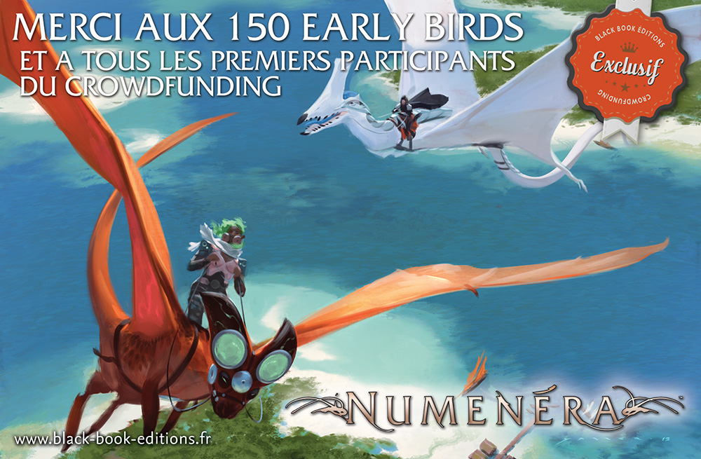 - Afin de permettre à ce jeu ambitieux de voir le jour en français ! Publier un jeu entièrement nouveau, de surcroît un ouvrage de plus de 400 pages et en couleur, n'est pas synonyme de succès assuré à l'heure des rééditions des anciens jeux. Numenéra a reçu de nombreuses récompenses (voir plus bas) et bénéficie d'une excellente presse aux USA, mais cela suffit-il ?