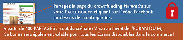 Merci à tous de votre participation et n'oubliez pas de continuer à promouvoir le partage de la page Facebook, que vous pensez participer financièrement ou nom à ce projet (certains attendent sans doute que leurs boutiques participent - une contrepartie leur est destinée - pour leur rester fidèle !) : une fois 500 partages atteints (déjà plus de 180 en moins d'une journée), les 16 pages du scénario Vortex seront ajouté aux livrets des Écrans du MJ - que cela soit ceux de ce crowdfunding comme ceux qui seront disponibles en boutiques spécialisées ! :)