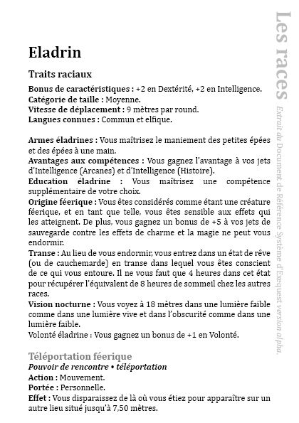 Voici les races que je propose. Tirées du Manuel des Joueurs 1 & 2, j'ai adapté leur traits pour que ça colle à la mécanique du SRD (au lieu d'avoir par exemple un bonnus à +2, on a un avantage). Les voici en image, avec aussi une tentative de ce que ça peut donner en PAO (j'ai comencé par une page de droite) :