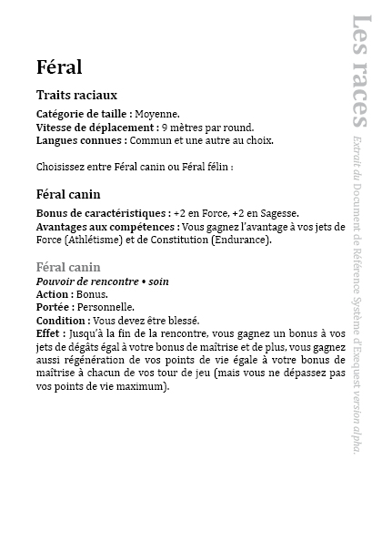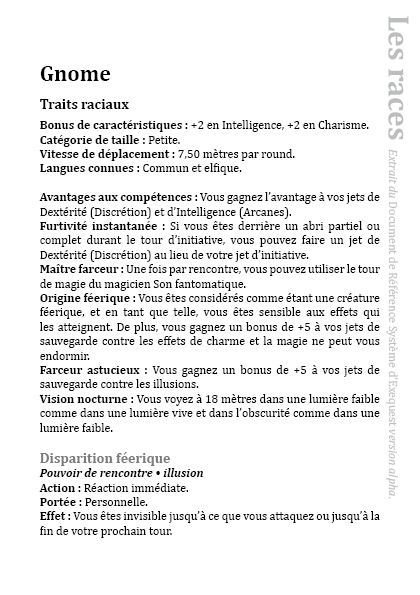 - Les caractéristiques : J'incluerai la mécanique générale du système d20, ainsi que la liste des compétences, classées selon les caractéristiques.