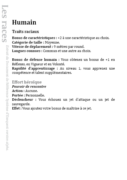 J'ai aussi vu les travaux du Grumph, notamment son Gamma World, que je trouve très bien écrit. Mais je en compte pas reprendre ses travaux, car bien que j'ai envie d'apporter une "touche Exequest", j'ai quand même envie de créer quelque qui soit plus proche de D&D4.
