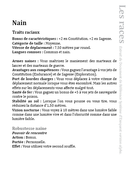 Après, je ne sais pas si les deux systèmes se mélangent bien (mettre un bonus de +2 ou bien la maîtrise pour les tests d'Endurance du nain, si on cumul ça avec un avantage... ). J'avais peur de quelque chose de trop abusé (mais je pense que c'est le cas avec ce que j'ai fait, c'est pour ça que je demande vos avis).