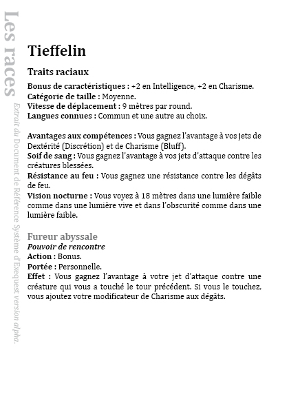 Je ne suis pas trop d'accord avec certaines affirmations, les tieffelins et les éladrins existaient bien avant D&D 4. Et le tieffelin était une race de base jouable dans certains settings D&D 3 (typiquement les Royaumes Oubliés).