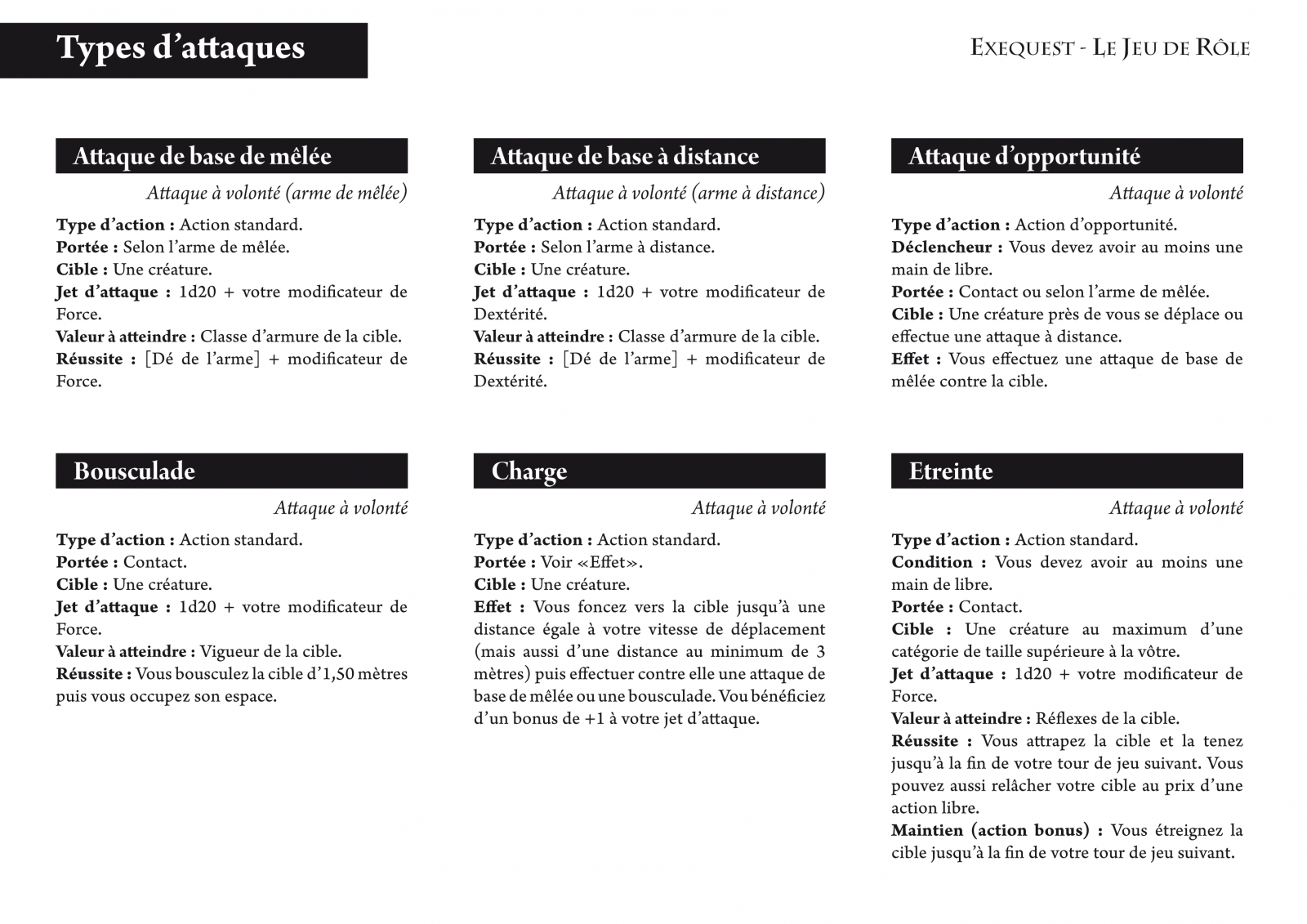 Enfin, voici un petit aperçu de mes travaux. Je vais certainement opter pour des fiches de règles qui vont tenir sur du A4 paysage, et dont chaque joueur à la table aura son propre exemplaire (pour moi, c'est beaucoup plus simple lorsqu'ils ont les règles sous les yeux). Chaque fiche concernera un point de règle spécifique. Pour commencer, voici une fiche sur les types d'attaques courantes que toutes les classes peuvent faire :