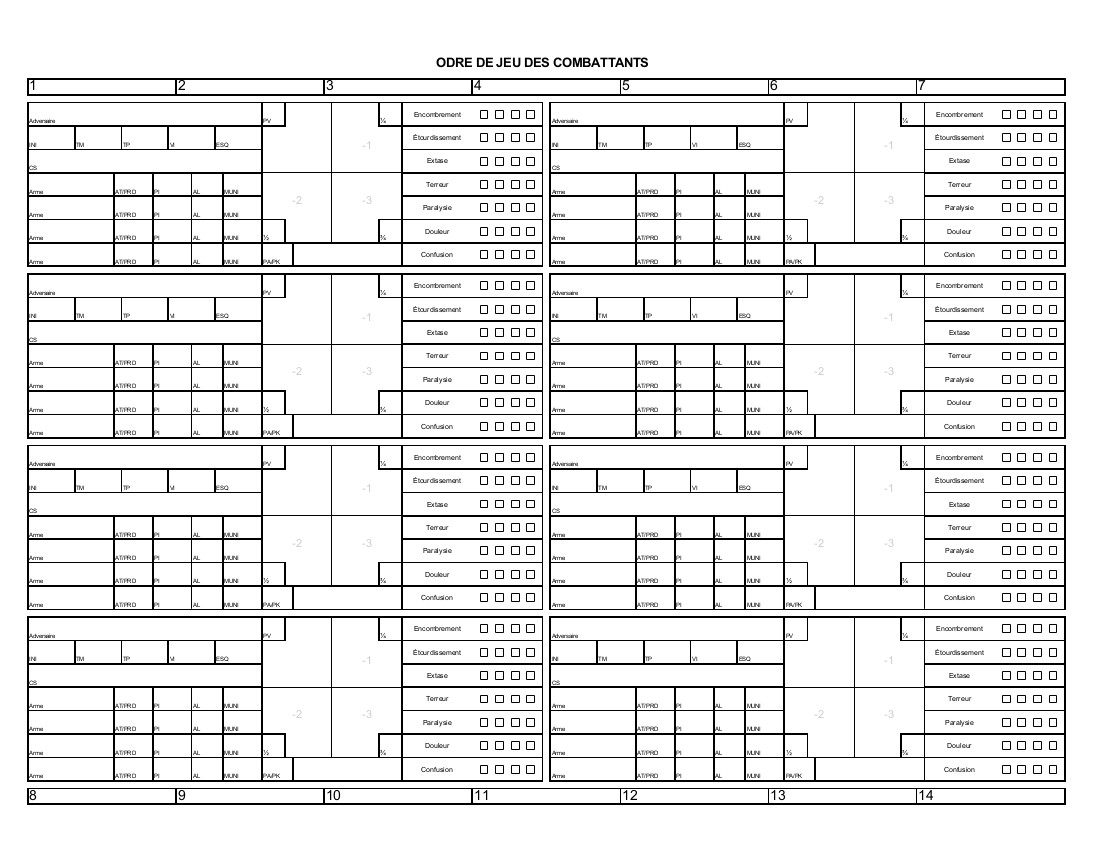 Je vais tenter de poster une image de l'Excel que j'ai fait (ca donne une feuille A4 pour 8 combattants).