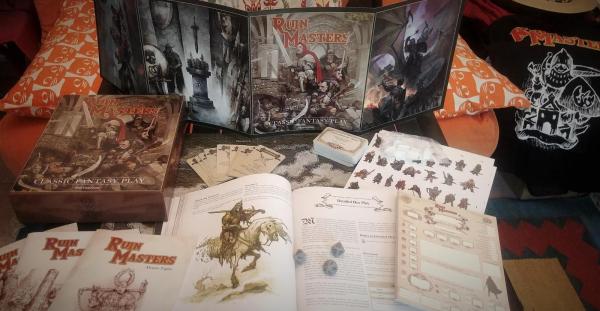 Pour rappel c'est un dungeon crawler de RiotMinds avec comme d'habitude de tres belles illustrations. Un JDR old-style en angliche mais qui semble assez simple d'acces. Le premier pledge PDF est a 17€ et le premier pack est assez riche pour 29 € ( Rulebook 150 à 200 pages en hard cover, Ruin Master Screen, Dungeon crawl adventures (PDF) , Deck of Start-up-Cards, 20 Character Sheets , 3 Cut-Out Sheets, 3 x 5 Combat mode Markers, + PDFs ) mais il faut quand même ajouter les frais de porc (!) ...18€