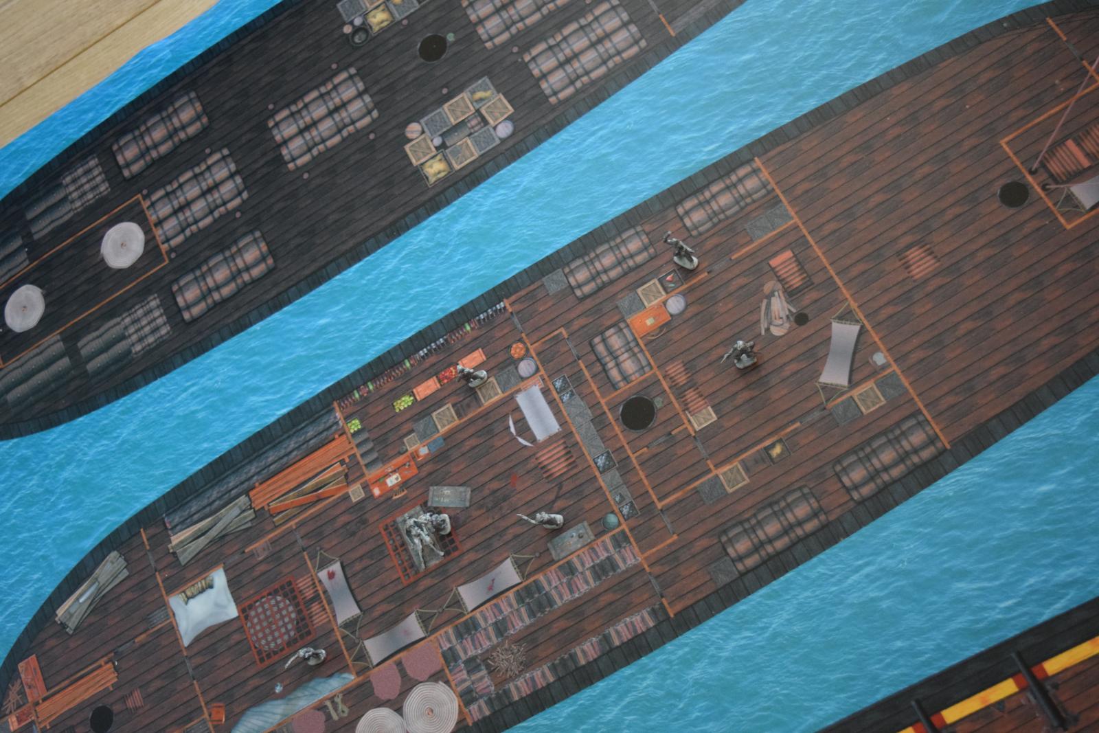 Plusieurs raisons à ça. Déjà le quadrillage classique à 1,5m par case ne correspond pas du tout à l'échelle d'un affrontement sur un navire. C'est bien plus étroit, l'affrontement est plus dense, plus resserré, que ce soit dans les pièces, les coursives ou même sur le pont.