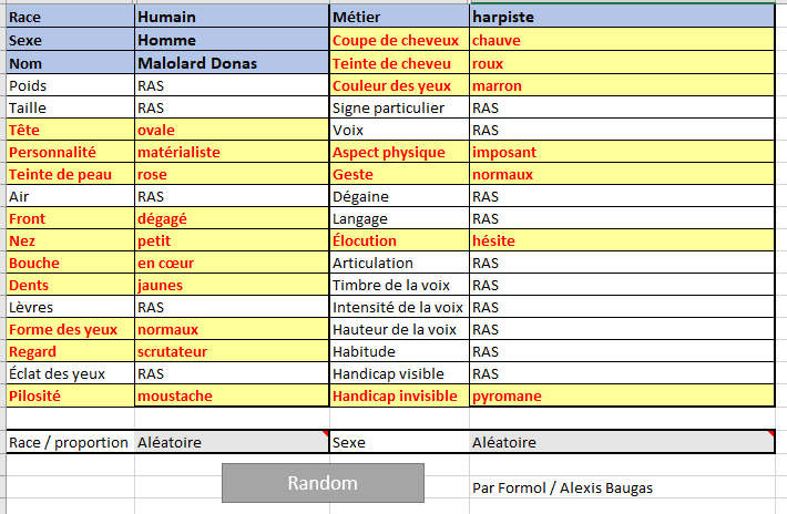 La lecture est simple : vous lancez la génération de votre PNJ, et vous donnez 2-3 phrases de description par rapport aux cellules en jaune. Ici par exemple, nous avons un humain avec le front degagé et les dents jaunes, chauve mais qui possède une belle moustache... il se trouve qu'il est aussi pyromane, mais ça, c'est à vos joueurs de le découvrir