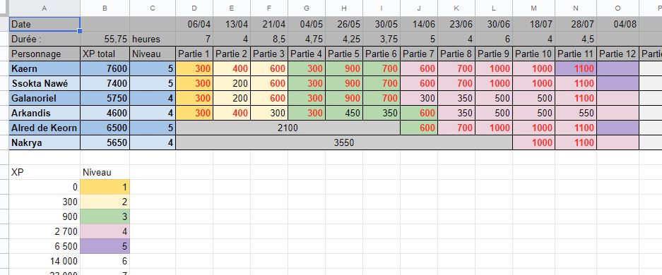 Là on peut voir qu' à la prochaine session, 3 joueurs seront lvl 5, et 2 devraient l'être à la fin de la session. J'ai un joueur "à la traine" mais il ne peut pas venir très souvent, je ne sais même pas s'il va continuer. Mais dans l'ensemble, ce sera assez équilibré.