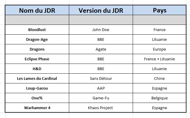 Je vous propose ici de lister pour chaque jdr en VF encore en vente chez l'éditeur (on ne va pas compter les anciennes versions plus éditées, sinon ça nous ferait un sujet infini et non utile) le nom du pays où il a été imprimé.