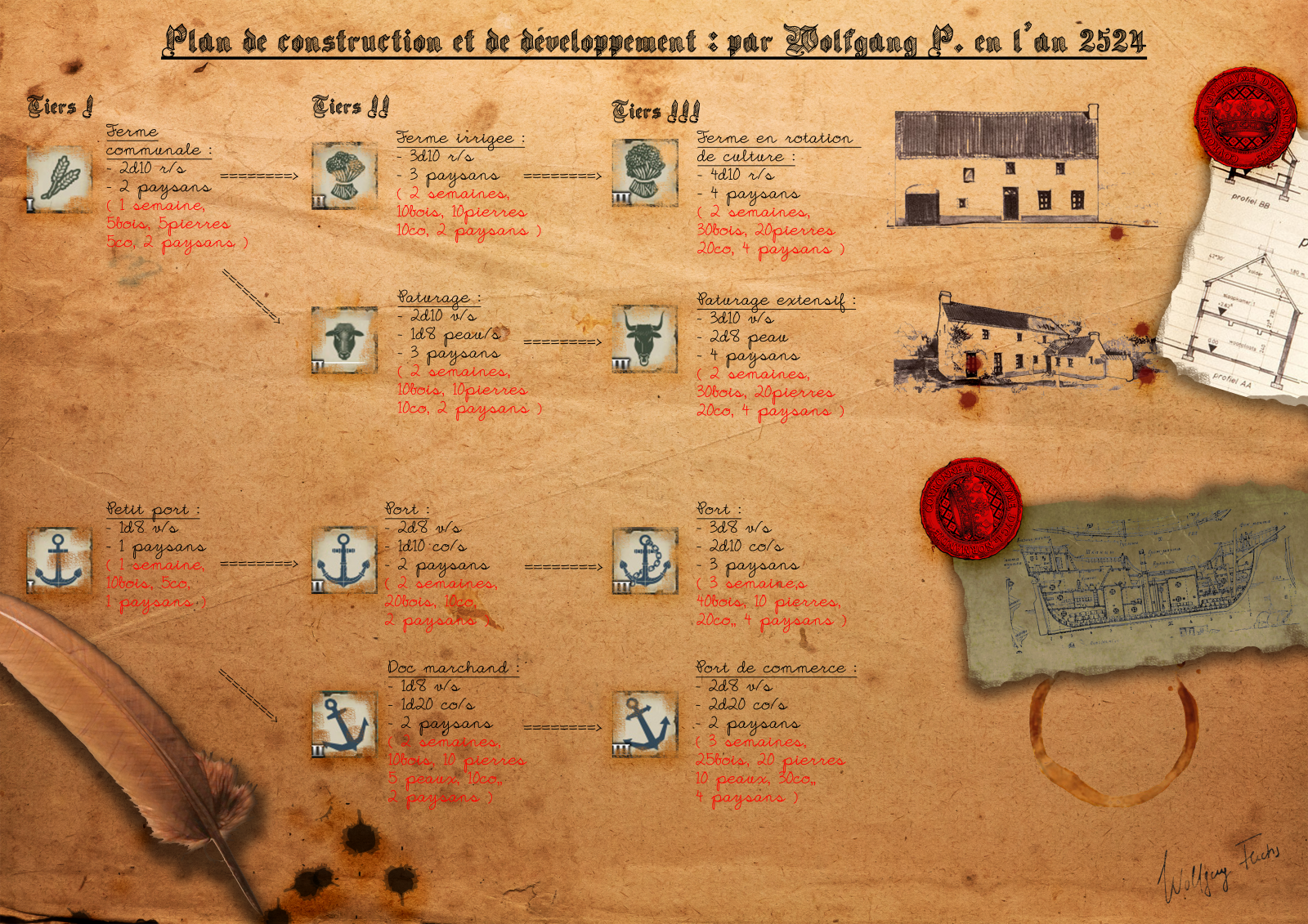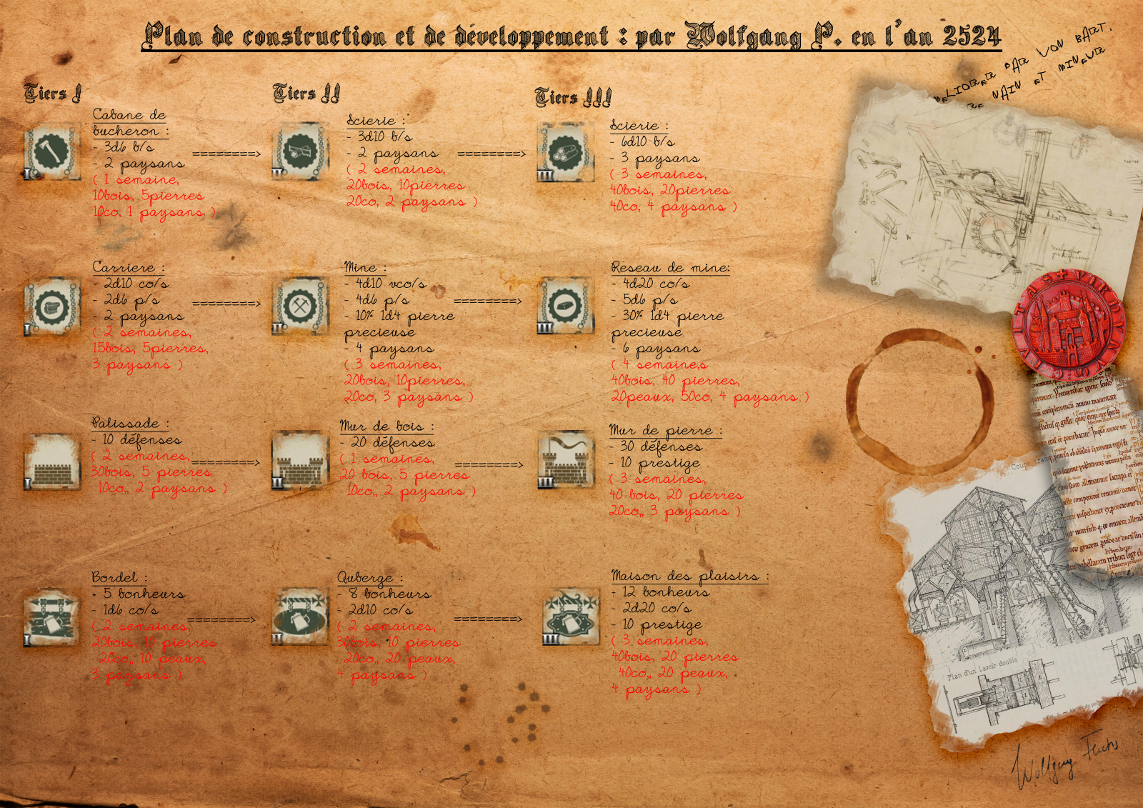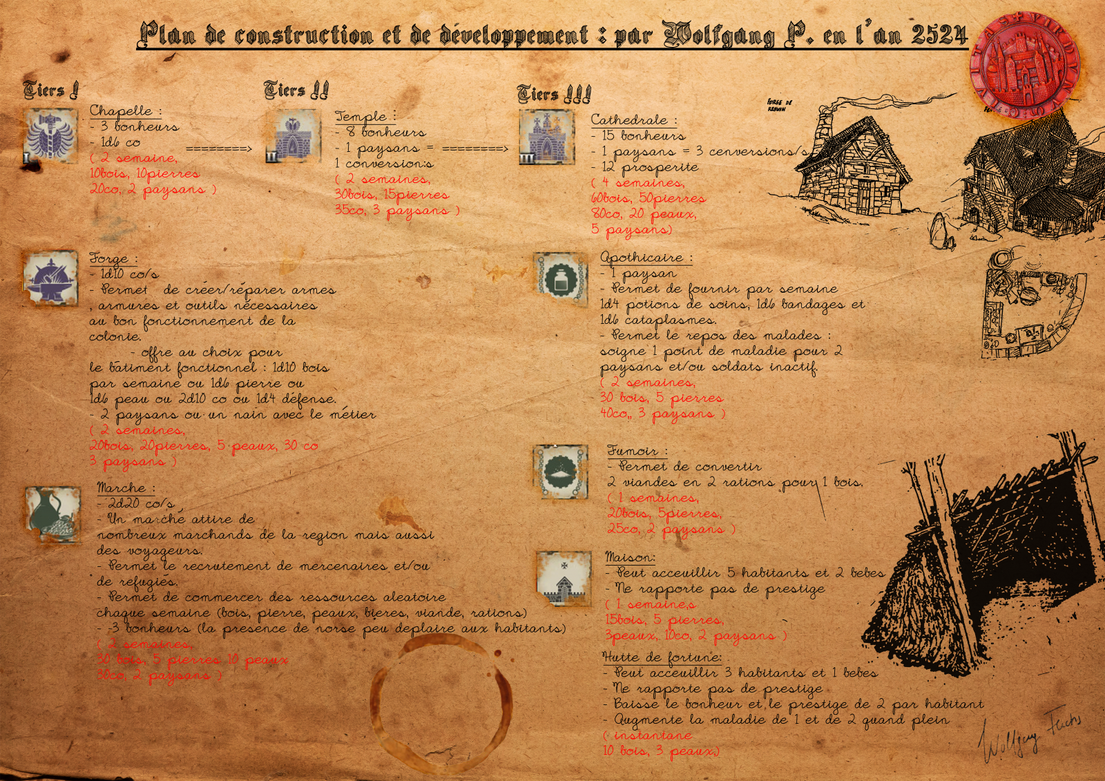 Je voulais donc partager ce travail de longue haleine car comme je le disais cela fait maintenant deux ans que cette campagne dure et que j'ai pu voir mes PJs s'amuser et s'impliquer dans le développement et la protection de leur petite communauté. J'espère que le plaisir sera au rendez-vous pour vous aussi si jamais vous vous lancez à l'aventure. De plus, ces règles peuvent s'appliquer à quantité d'autres JDR car les bâtiments restent réalistes.
