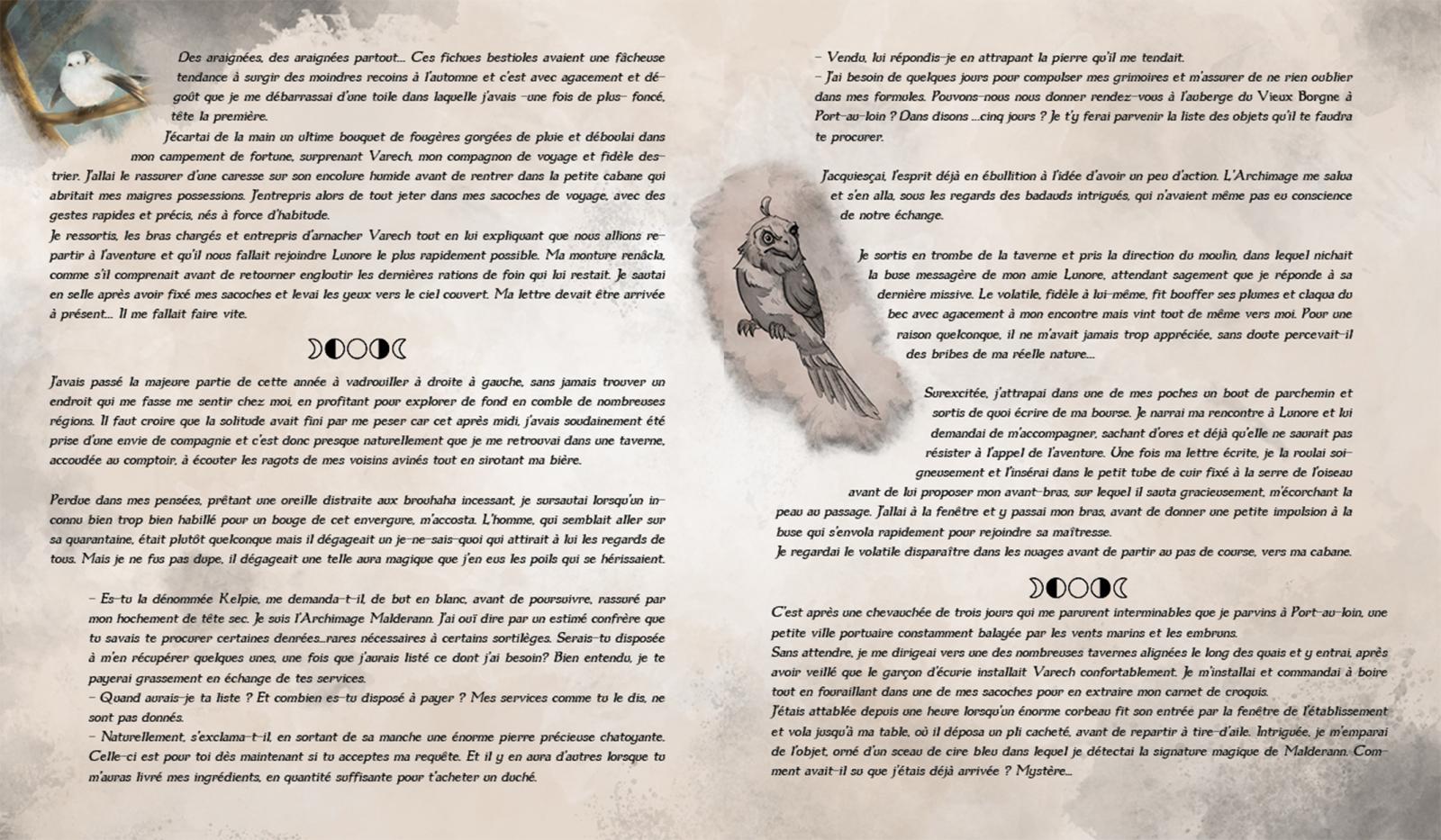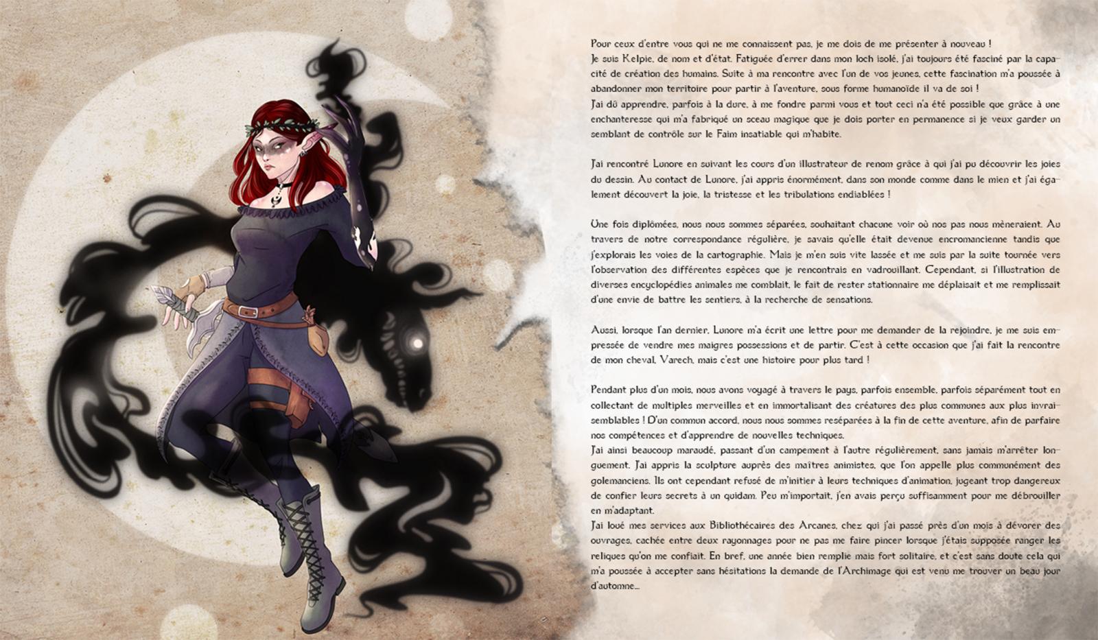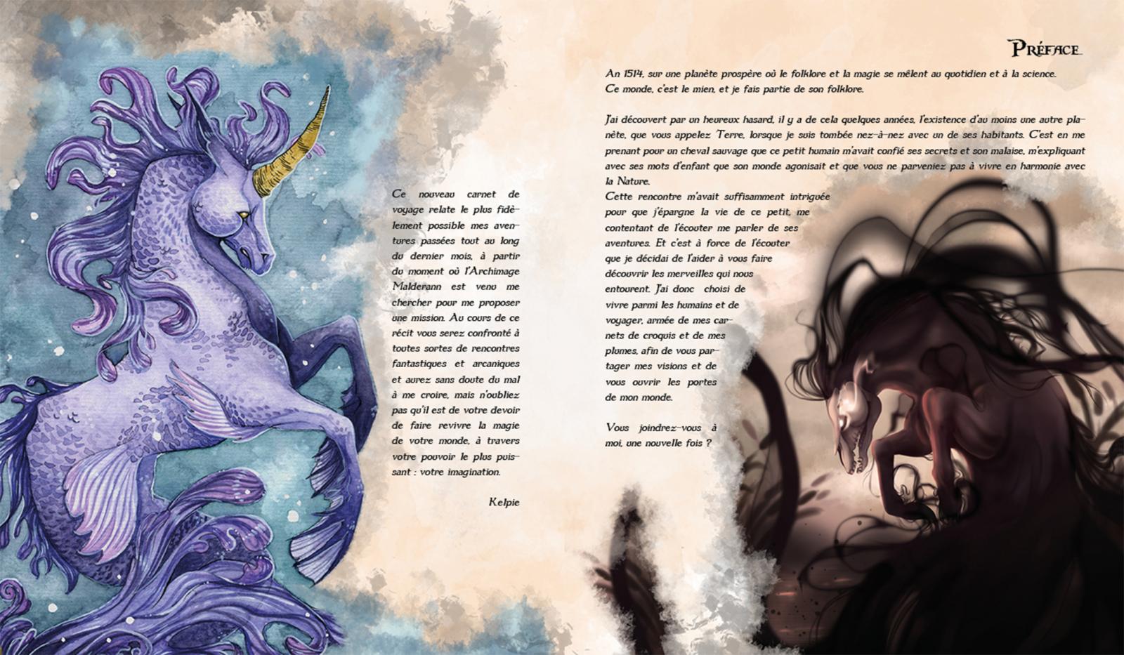 Mais commençons par le commencement, les Carnets, kessecé ? Eh bien mon amie L'Encromancienne et moi-même avons décidé de créer un univers médiéval fantastique dans lequel nous avons donné naissance à nos deux personnages : Lunore (L'Encromancienne) et Kelpie. Chaque année, Lunore et Kelpie partent à l'aventure pendant plus d'un mois pour rencontrer les créatures fantastiques qui peuplent leur monde et vous les faire (re)découvrir. Ce sont donc des aventures RP qui se présentent sous la forme de deux carnets de voyage/bestiaires. La particularité de notre collaboration ? Nos récits s'entremêlent lorsque nos personnages intéragissent lors de leurs aventures en duo ! Cette année nous avons renforcé cette dualité en choisissant d'éditer 2 livres bien distincts, l'un sous le signe du soleil et l'autre sous le signe de la lune, les deux astres que nous avons associés à nos personnages.