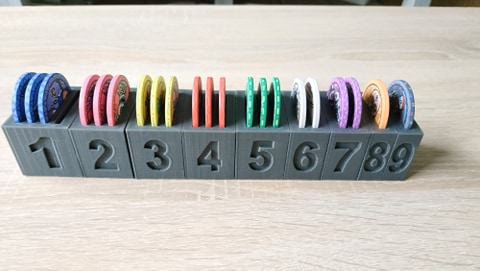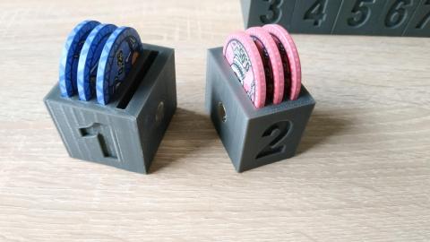 Si ça peut en intéresser certains, j'ai créé des supports pour jetons de poker dans le but de m'en servir comme indicateurs pour les emplacements de sorts. J'ai déjà testé un peu tout ce que j'ai pu trouver à faire en impression 3D : utilisation de d6, de pièces de monnaie, de jetons faits avec l'imprimante 3D, etc. Et au final j'ai voulu tester de développer ma propre idée.
