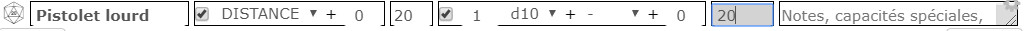Et aussi pour la partie armes/attaques je ne sais pas trop comment la remplir , je voudrais rentrer pour le perso de lord duncan son pistolet lourd mais les jets de dés sont bizarre .