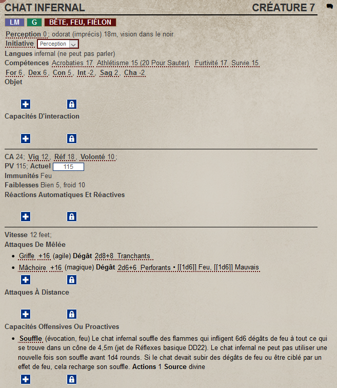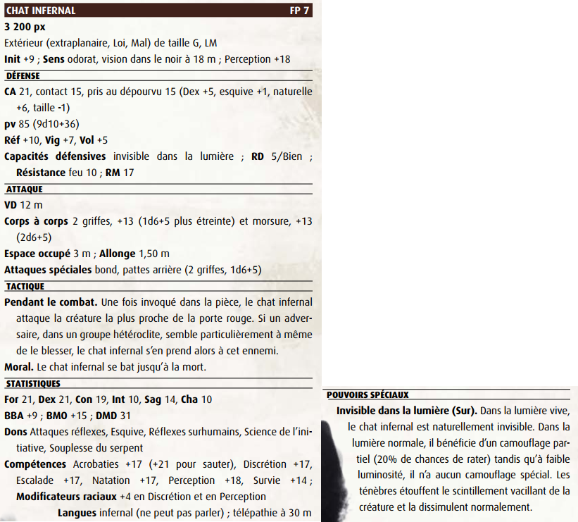 - Autre exemple avec la conversion d'un chat infernal, créature qui n'existe pas dans le Bestiaire V2, j'ai dû improviser en m'inspirant de créatures du même type et du même niveau.