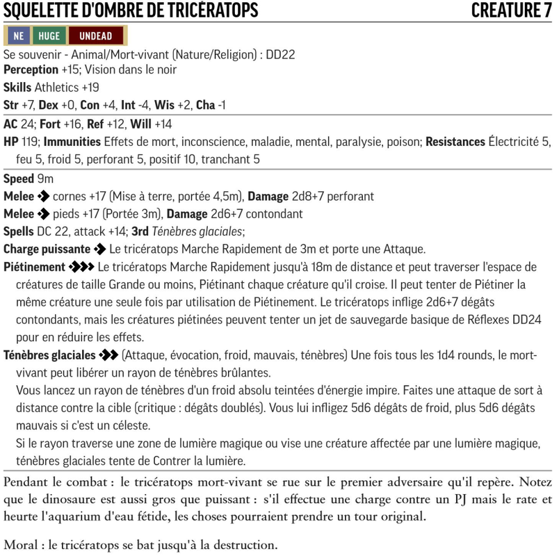 - J'ai dû créer un squelette d'ombre de tricératops, absent du bestiaire, en m'inspirant du tricératops V2 et en lui ajoutant quelques spécificités d'ombre. Conversion assez basique, je ne me suis pas trop foulé (et mes joueurs ont eu une chance insolente dans leurs jets de dés, snif). La fiche de monstre V2 a été générée grâce à monster.pf2.tools, je vous le recommande car il donne notamment des valeurs moyennes pour chaque carac selon le niveau du monstre, très utile donc pour les conversions.