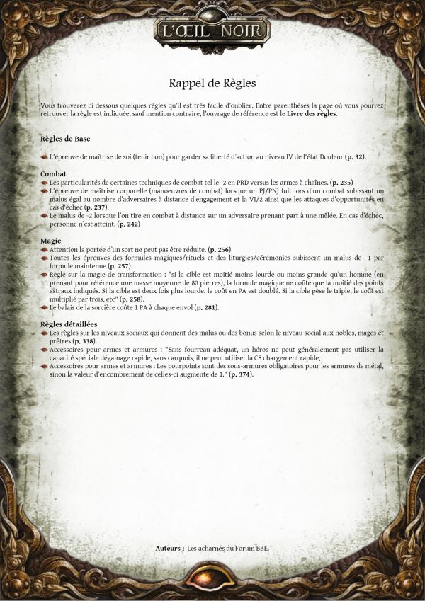- Les particularités de certaines techniques de combat tel le -2 en PRD versus les armes à chaînes, l'impossibilité de parer une arme à deux mains (ou d'hast ou à chaine) avec une dague ou une arme de duel (sauf si tu as blocage en croix), et les maladresses avec les armes à chaine se font sur 19-20 (p. 235-236).