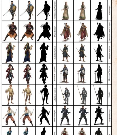 Tu peux utiliser le "Charakter_Illustrationen" et le "Kreaturen Illustrationen" du scriptorium pour aussi faire des pawns (ceux du dessus utilisent ces images),l'avantage est que tu peux toi même mettre les noms que tu veux ou la version française.
