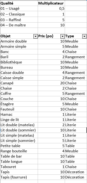 Voilà ce que cela donne. J'ai considéré 4 qualités de mobilier différent (usagé, classique, raffiné et de maître) modifiant par un facteur multiplicateur le prix de l'objet.