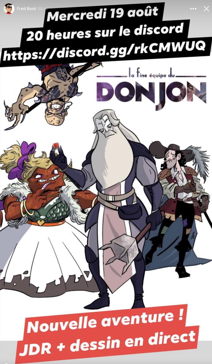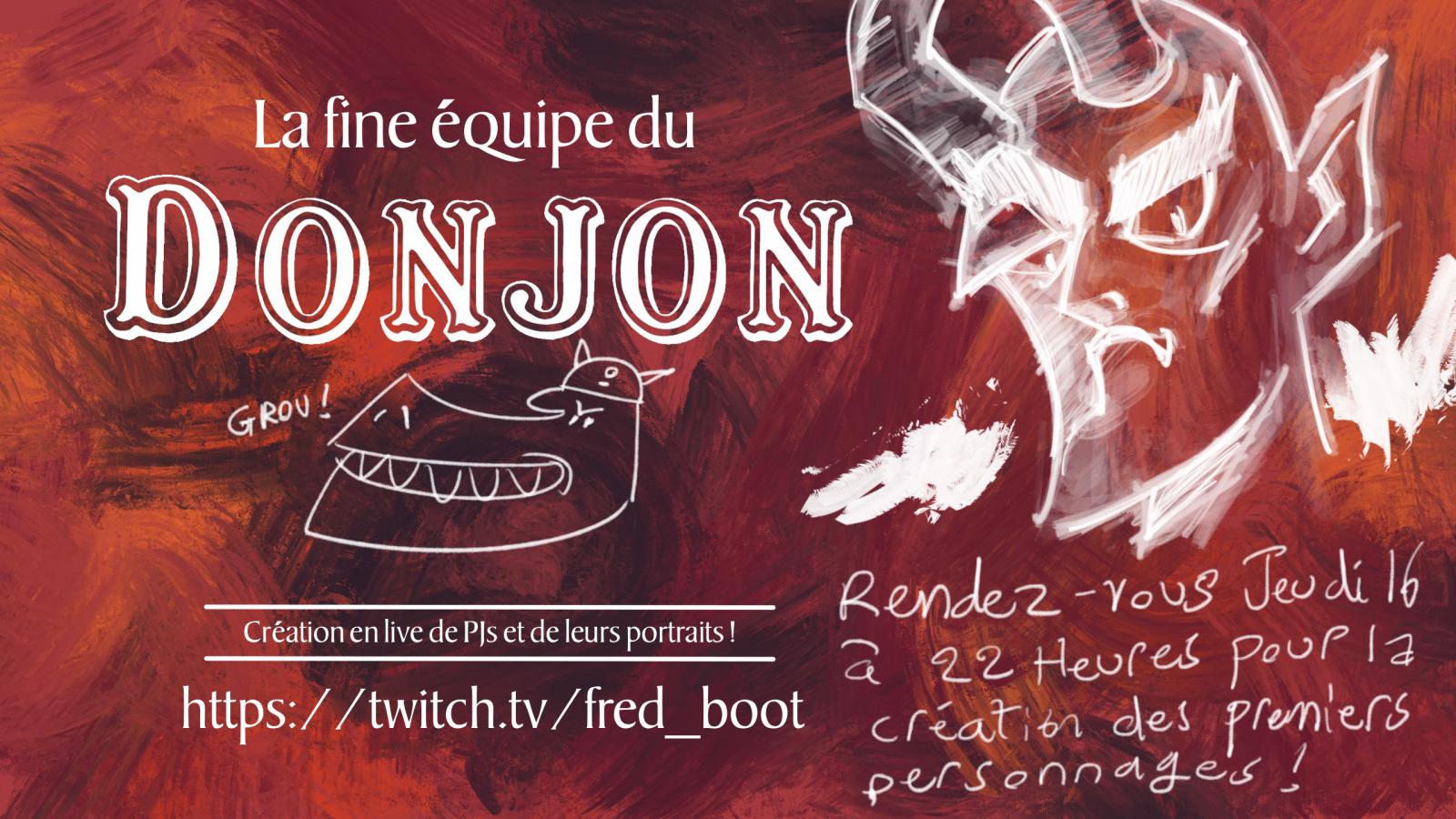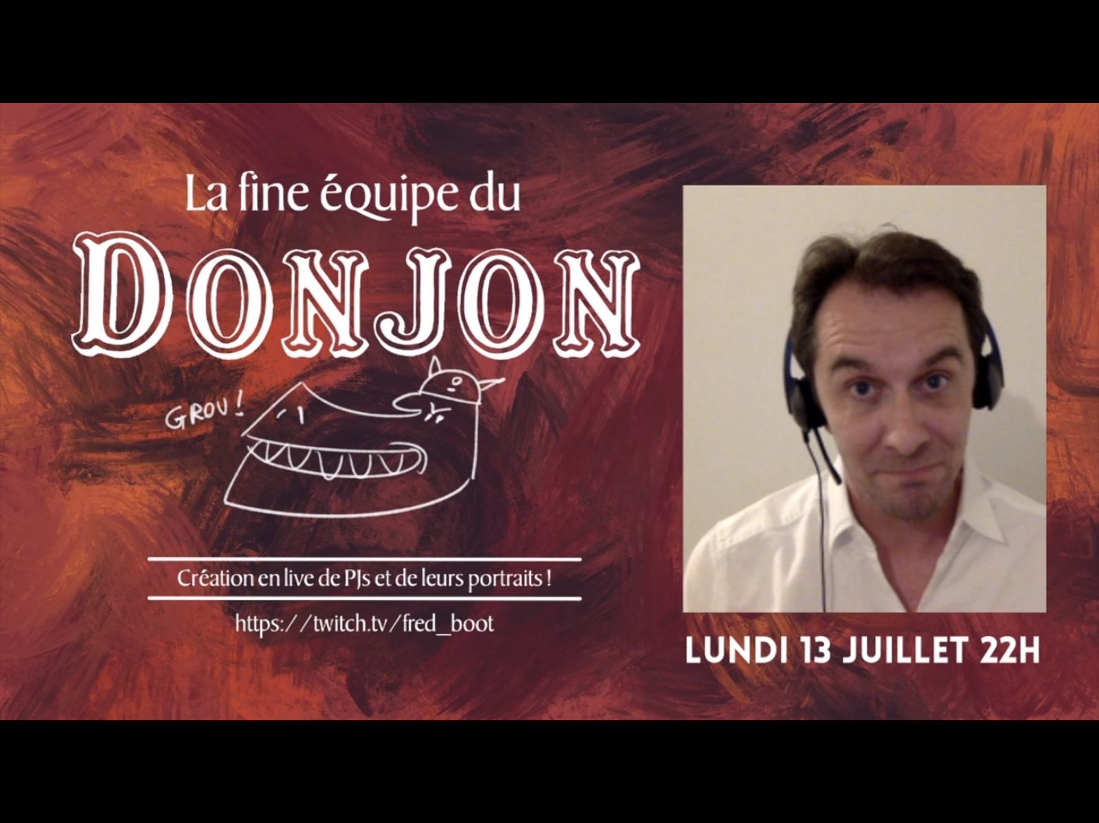 Rendez-vous ce lundi 13 juillet à 22 heures sur https://twitch.tv/fred_boot pour la Fine équipe du Donjon. On va créer ensemble le plus cool des groupes de PJs, que je dessinerai en direct. Explications dans cette video. Et si tout se passe bien, on le proposera à Créa’n Play !
