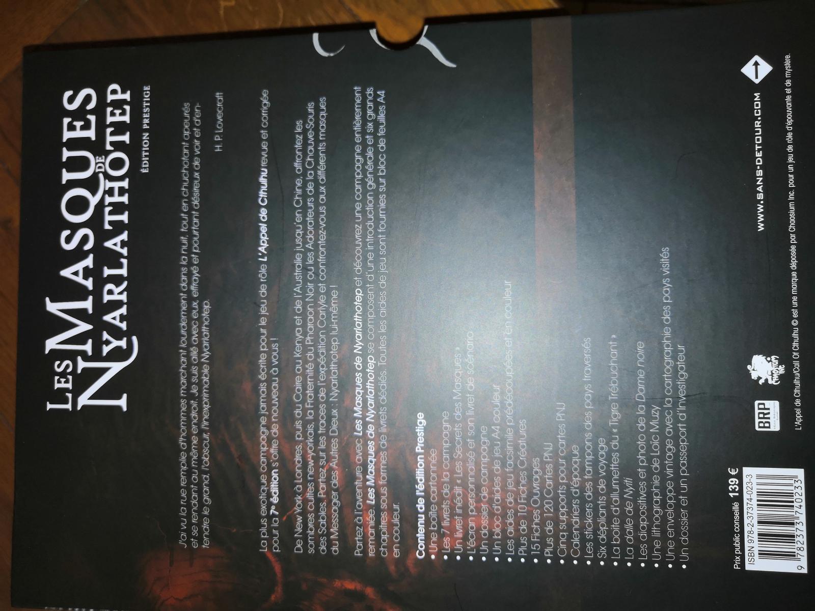 Je vends donc la campagne Les Masques de Nyarlathotep - VF - Editions Sans Détour (édition prestige). Elle a été ouverte et certains livrets lus une fois. Sous cette réserve, elle est en parfaite état et complète.