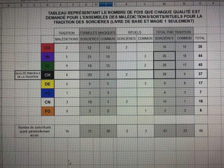 Dans ce tableau on peut noter que pour les sorts de la sorcière, les qualités IN, IU et le CH sont les 3 les plus utilisés.