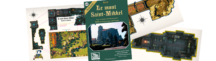 Et pour appâter le chaland, je met à disposition gratuitement "Le mont Saint-Mikkel" , "La Falaise Sanglante" et "l'Église brûlée", trois scénarios originaux, maquettés, illustrés, avec de superbes plans en couleurs !