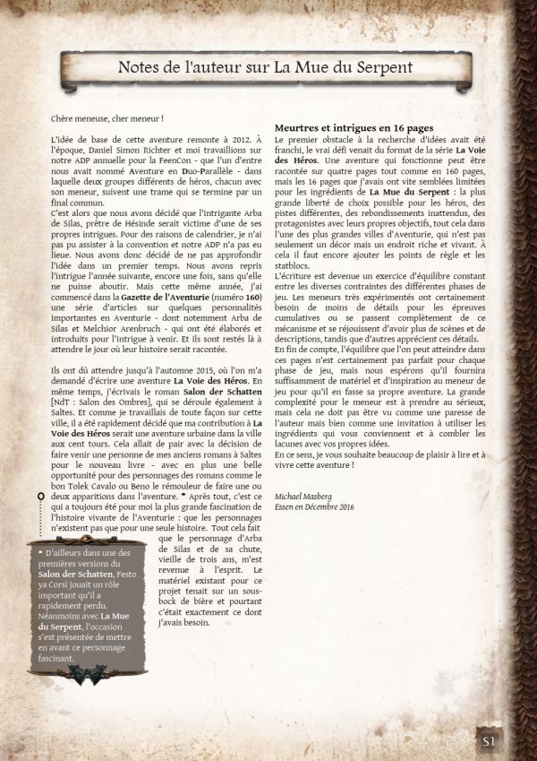 Malgré tout cela laisse encore pas mal de taf pour le meneur (normal aussi avec les HW). Du coup je me suis penché sur les suppléments du Heldenwerk-Archiv mais honnêtement un peu déçu par le contenu. Autant sur le Mhanadi Sombre cela te rajoute quelques éléments à intégrer à tes scènes ou pour varier, autant là dans les 3 pages tu as 2 pages de description de la ville en mode texte qui pourraient laisser certains sur leur faim. Du coup j'ai décidé d'aller au delà des 3 pages originales des suppléments. Je suis en train de rajouter une carte de Saltes avec une 60aine de lieux car je préfère avoir une carte pour me repérer et situer les éléments et je vais ptet rajouter d'autres bricoles sur certains lieux. A suivre...