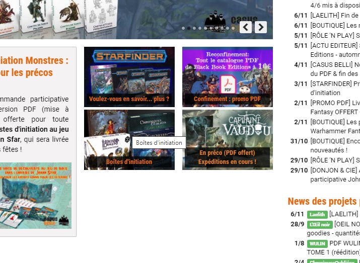 Ainsi donc ... mon mien pitchoune a essayé de fouiller dans le site à la recherche de la liste exhaustive des boites et autres kits d'initiation au jeu de rôle disponibles (dans le cadre de la rédaction de sa liste de Noël), et il s'y est un peu perdu. Evidemment, je l'ai aidé, mais cela a été l'occasion pour moi de réaliser que ce serait quand même plus simple s'il y avait un "rayon" consacré à l'initiation au jeu de rôle, qui aurait la qualité de regrouper tous ces produits-là, plutôt que de devoir passer par plusieurs recherches par mots-clés (à 11 ans l'héritier ne maîtrise pas encore l'art subtil de choisir les bons mots-clés). Ou alors simplement une page qui en fait la liste exhaustive (j'avais bien vu qu'il y a une liste, mais elle est loin d'être totalement exhaustive, et pour tout dire je n'arrive pas à remettre la main dessus, j'ai l'impression de toujours tomber dessus par hasard).