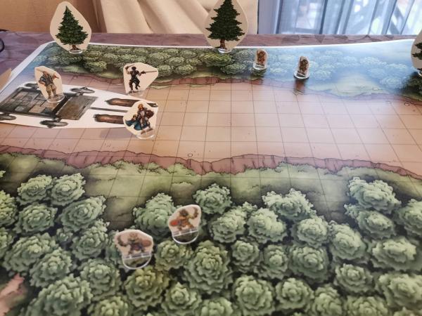 Très joli tes cartes et tes figurines papiers. Un charriot gardé par des joueurs, deux goblins en embuscades à gauche et deux goblins en ambuscade à droite, je crois connaitre