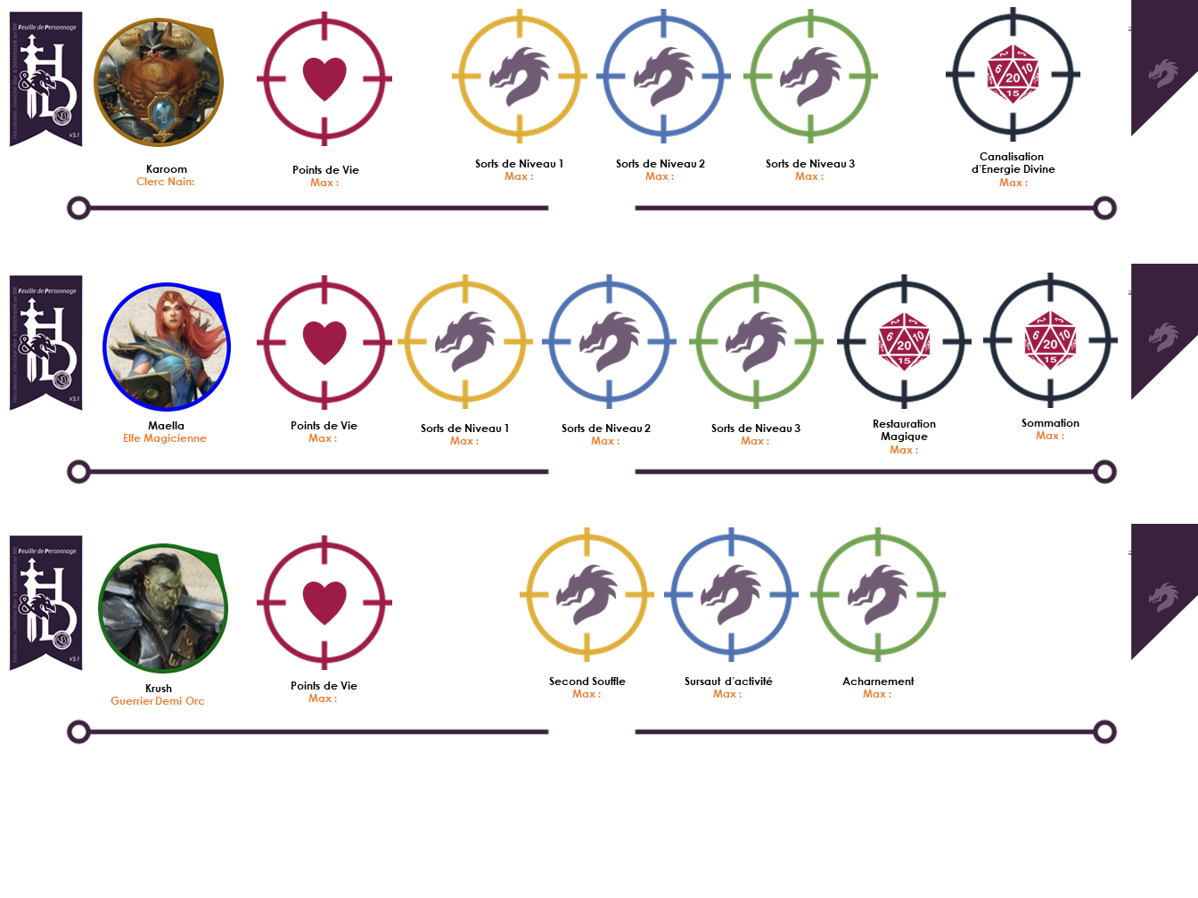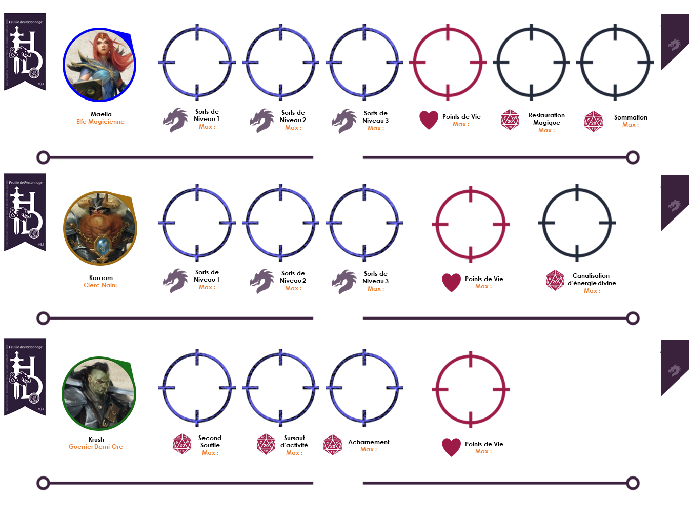 Salut Keno, pour info il existe désormais les nouvelles feuilles de personnage éditables et manuscrites 5e DRS (anciennement héros & dragons), ainsi que l'ajout de l'ensemble des cartes de sorts par classe sur le site officiel https://5e-drs.fr dans la rubrique liens utiles à droite sur la page d'accueil... Par ailleurs est aussi mis à disposition dans les liens une nouvelle feuille de route (tapis de personnage) par classe pour ceux qui désirent jouer avec des tokens ou jetons de poker, pour varier le plaisir immédiat... c'est exactement la même idée mais améliorée par classe. N'hésite pas à venir consulter notre travail (DHFTN et moi même) et nous laisser tes messages sur le discord officiel. Je te souhaite une excellente soirée et que la passion du jdr t'accompagne longtemps. Wylandïr.