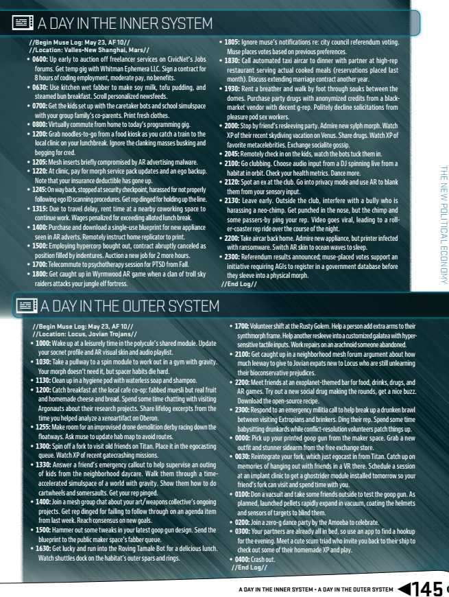 Eclipse Phase aborde de nombreux thèmes politiques ; en fait, nous partons du principe que tout est politique. Comme tous les auteurs, nous écrivons du point de vue de nos partis pris personnels. Notre optique spécifique est radicale, libératoire, inclusive et antifasciste. Si vous soutenez le sectarisme ou l'autoritarisme sous quelque forme que ce soit, Eclipse Phase n'est pas un jeu pour vous.