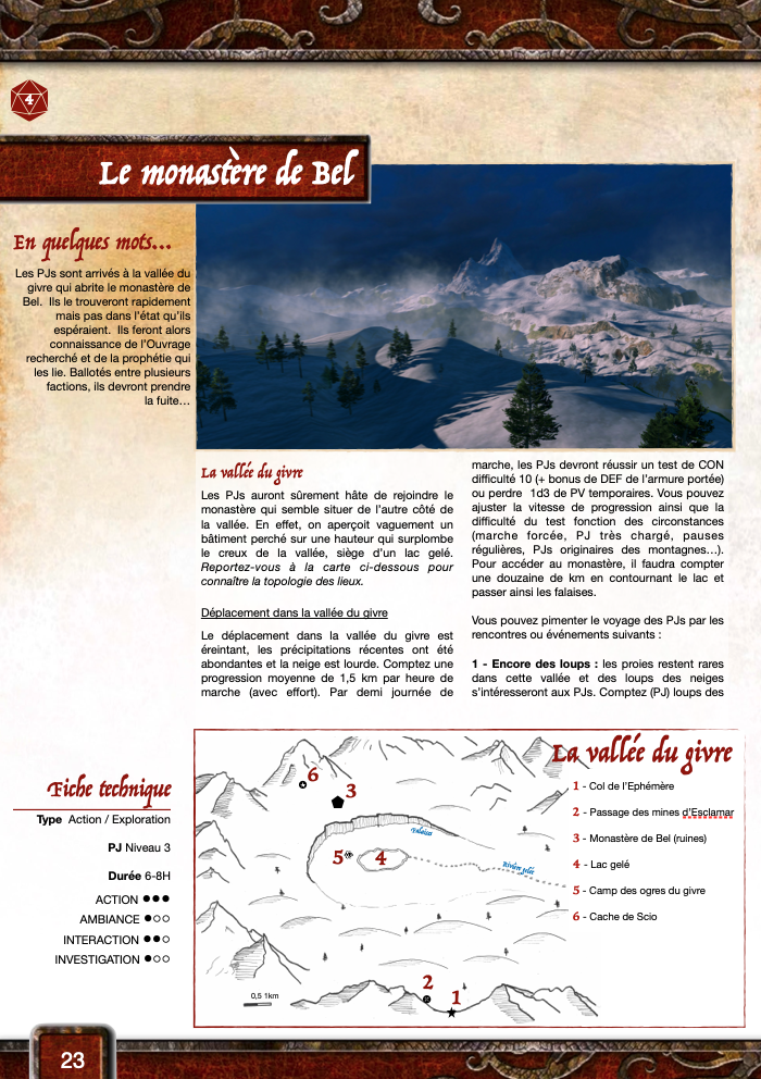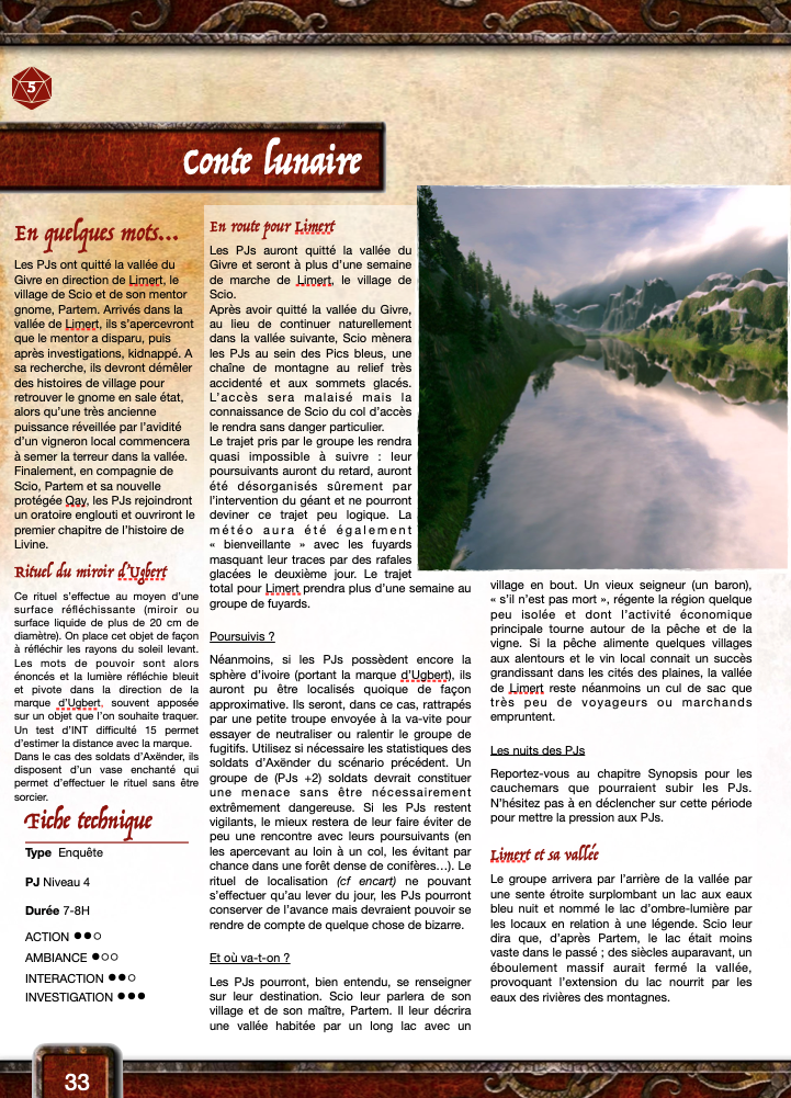 - L'aventure 5 "Conte lunaire" est également jouable séparément en ocultant l'introduction (la fuite de la vallée du givre) et la partie finale dans l'oratoire englouti. Les PJs peuvent être à la recherche de conseils auprès d'un vieux sage (Partem) isolé dans cette vallée de Limert. (niv 4)