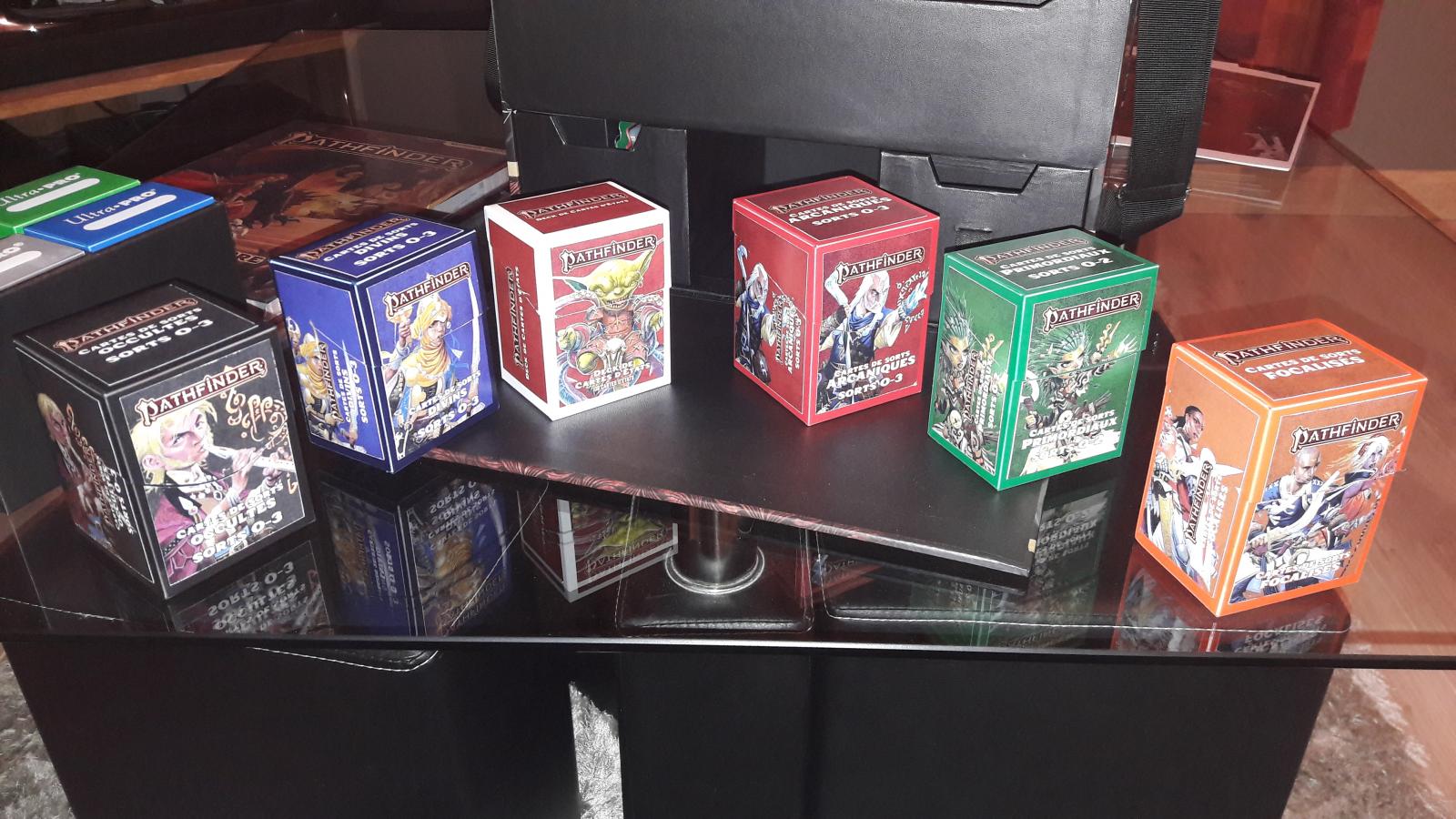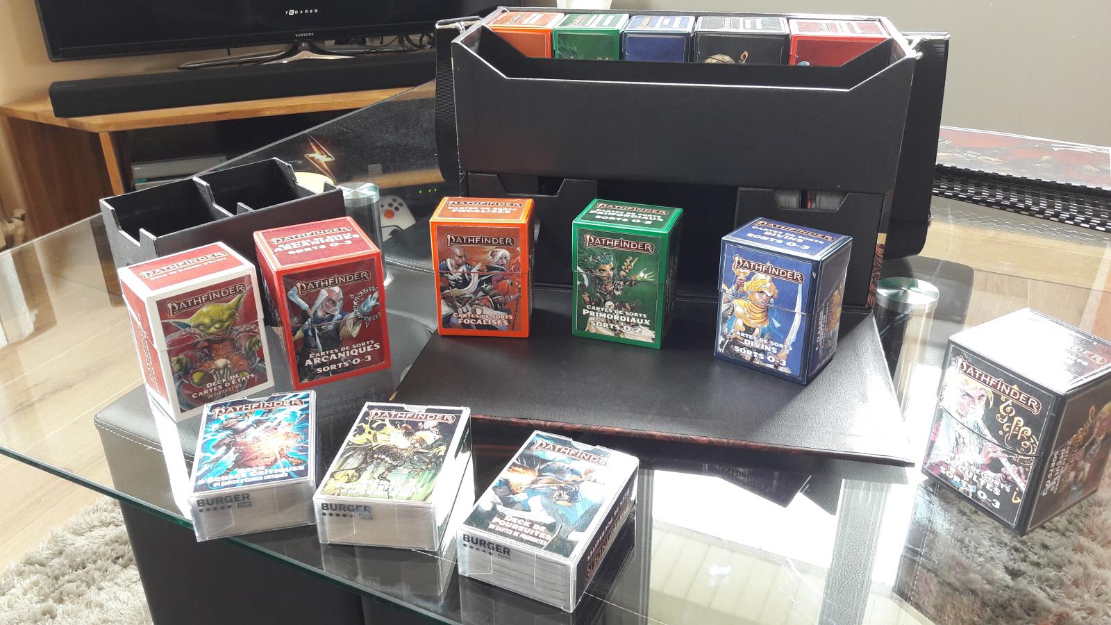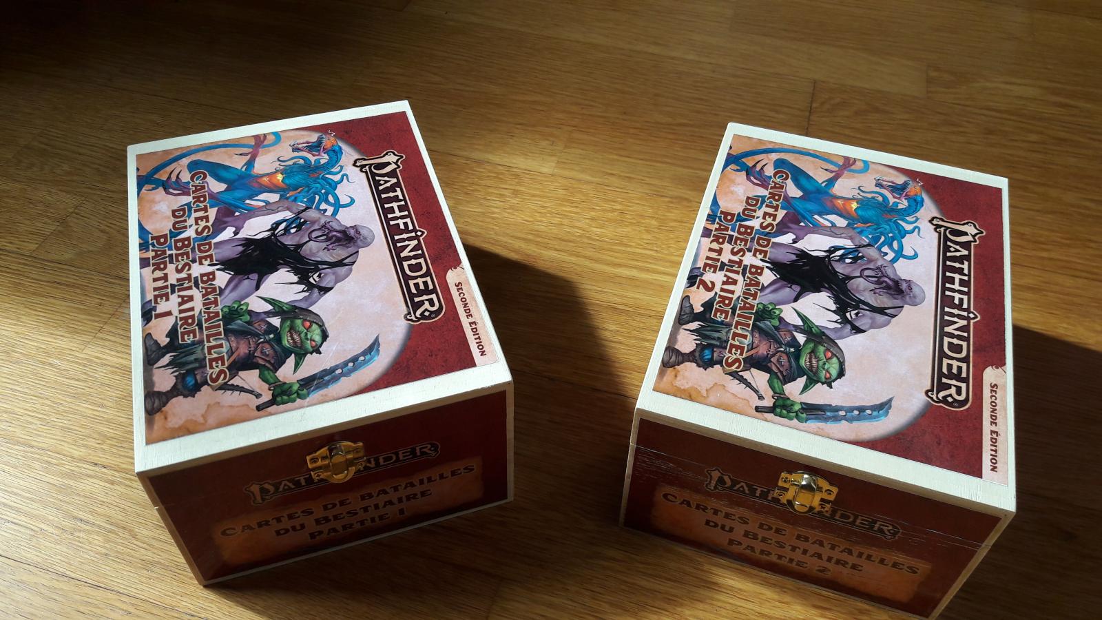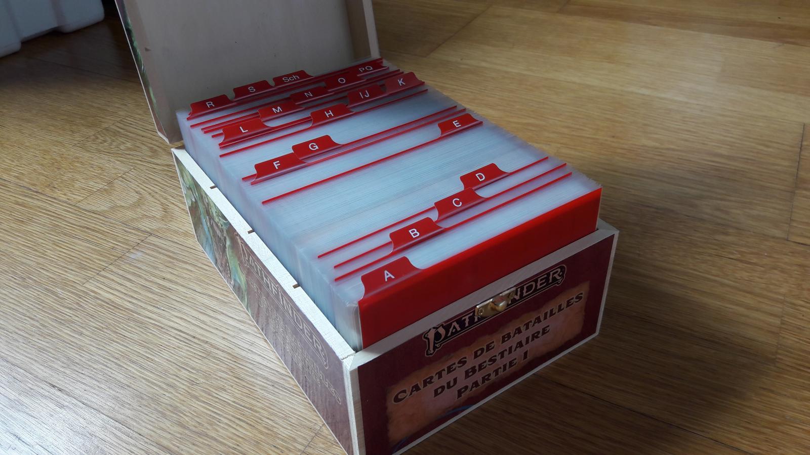 Tout ce qui est cartes, le met ça sous protèges cartes puis dans une boite à deck premier prix (style ultra-pro ou ultimate guard) que je "décore" éventuellement (CF. Cartes de sorts PF2)