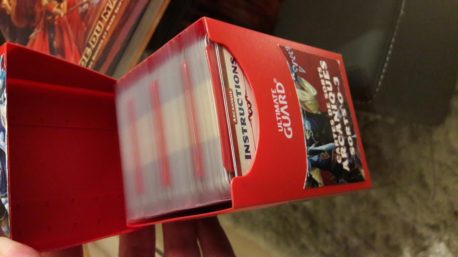 Toutes les cartes de sorts regroupées dans la boite rouge exclusive à la PP. C'est calculé, tout est sleevé et tout rentre (... sauf le deck d'Ombrelame de Role'n play, qui vient s'arriver grrr