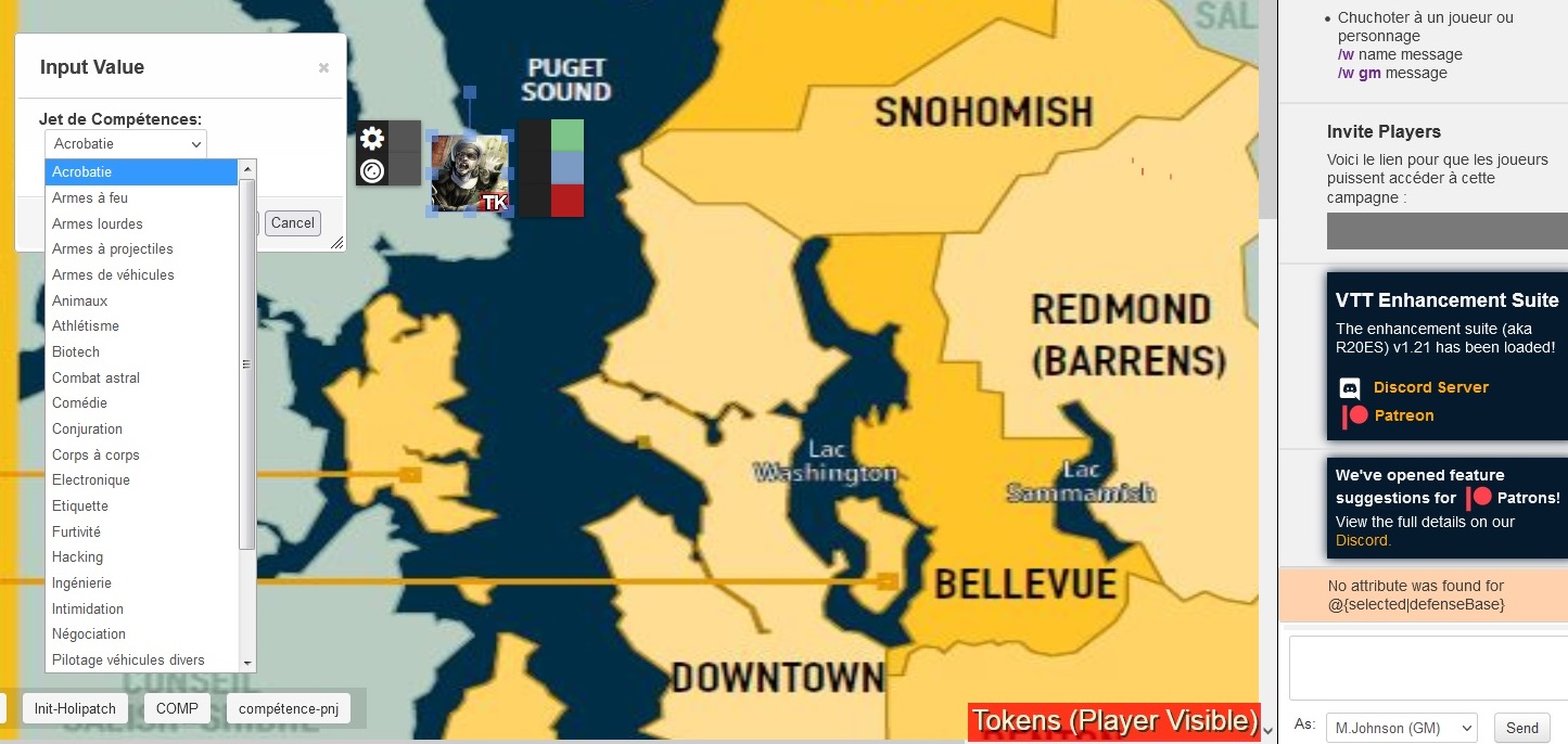 En gros il suffit de copier ça dans la section macro et de cocher la case créer un bouton et lorsque tu sélectionnes un token/jeton de PNJs puis que tu cliques sur comp-pnj dans l'image suivante tu peux choisir la compétence à lancer et ça te calcul le nombre de succès. Le seul problème c'est que j'ai pas les reroll des atouts en automatique. En gros ça donne ça :