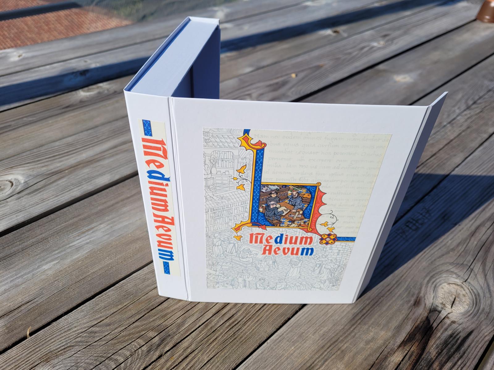 Je me suis donc commandé une boite A5 blanche pour Medium Aevum et des boites A4 noires pour le reste. Ensuite j'ai scanné les couvertures pour m'imprimer sur du vinyl autocollant ce que je voulais mettre sur la tranche et le recto. Le but était de faire simple, pas cher et pas trop moche. Le résultat correspond à mes attentes.