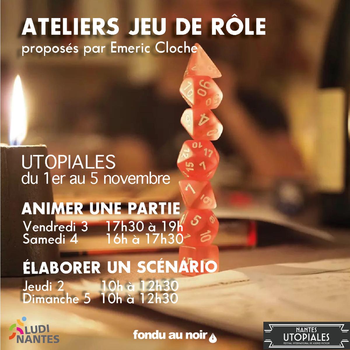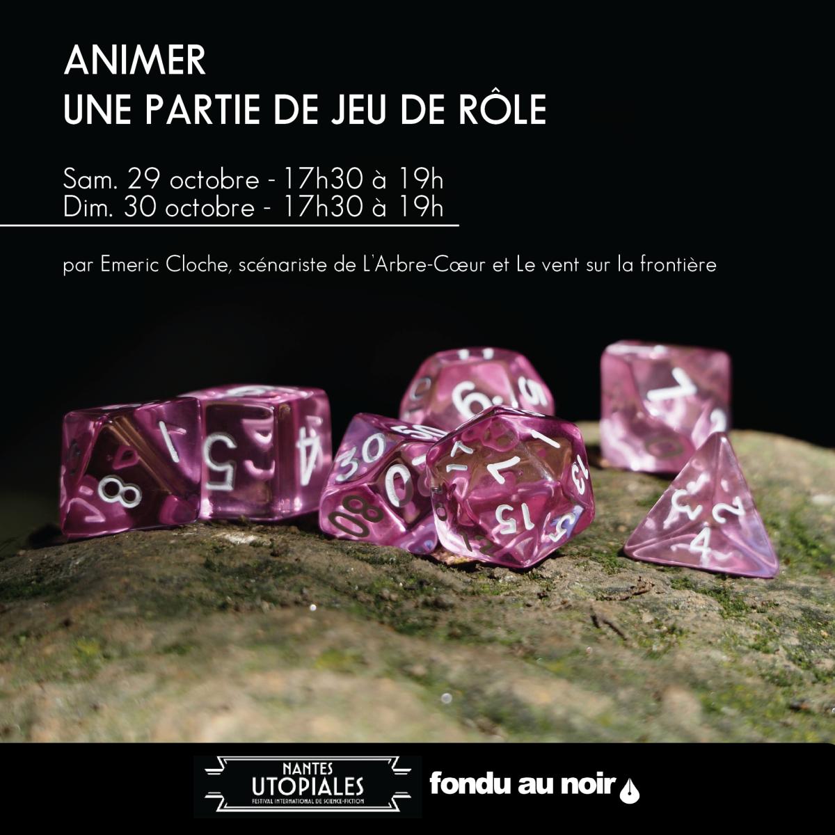 Oyez ! Oyez ! On se retrouve pour les Utopiales de Nantes le samedi 29 (salle Procyon) et le dimanche 30 Octobre (salle Aldébaran) avec un atelier "animer une partie de Jeu de Rôle".