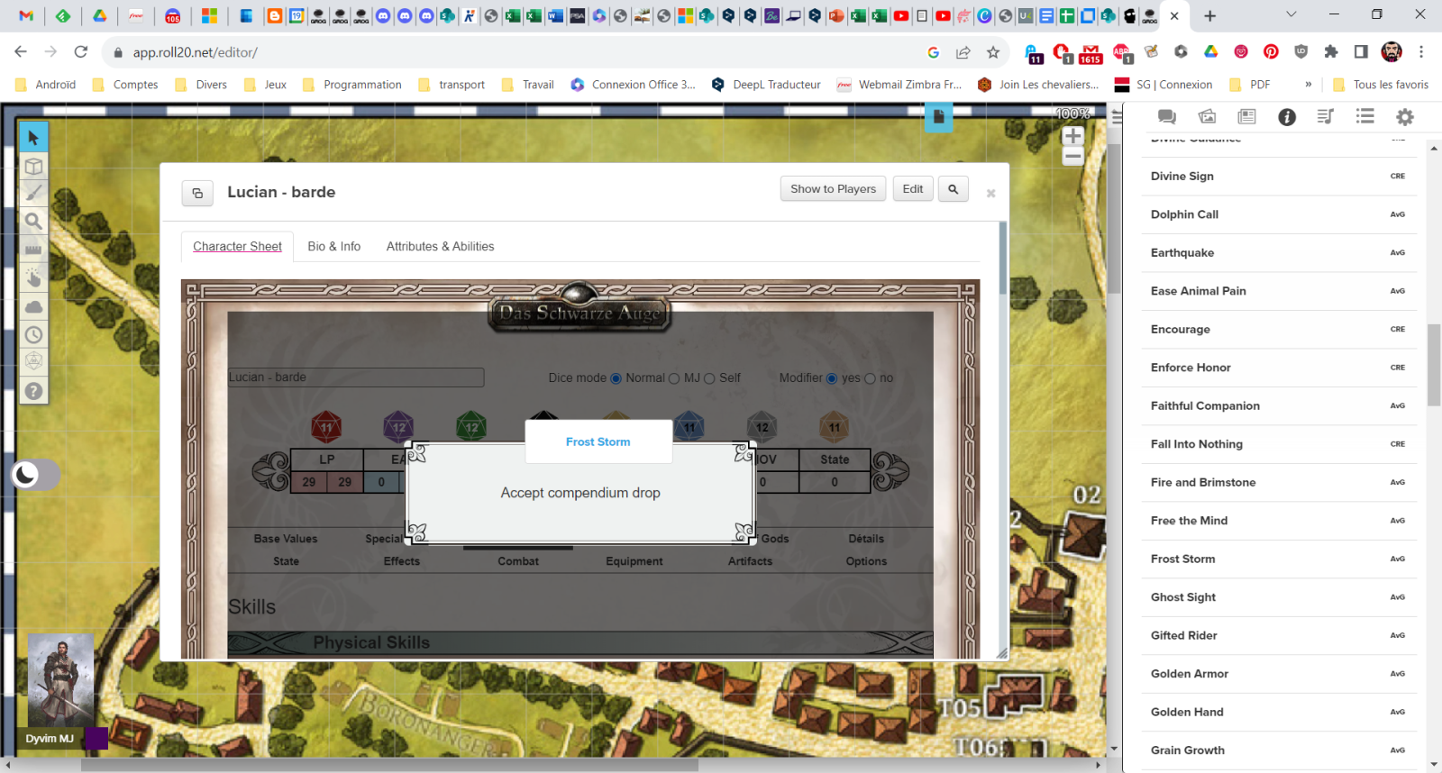 Roll20 permet en revanche de faire des traductions en français, en tout cas techniquement. Mais la question des droits pour la VF demeure et les compendiums sont vendus par Ulisses (VO/VA). Côté Roll20, tu peux jouer je pense avec la fiche en français et les compendiums en anglais. Mais je ne les ai pas achetés donc je ne peux pas confirmer ce point.