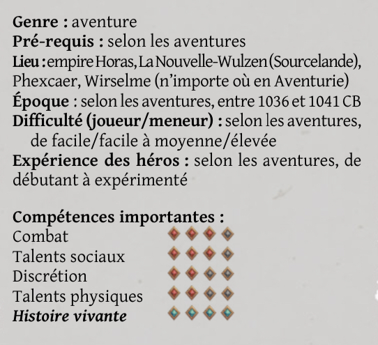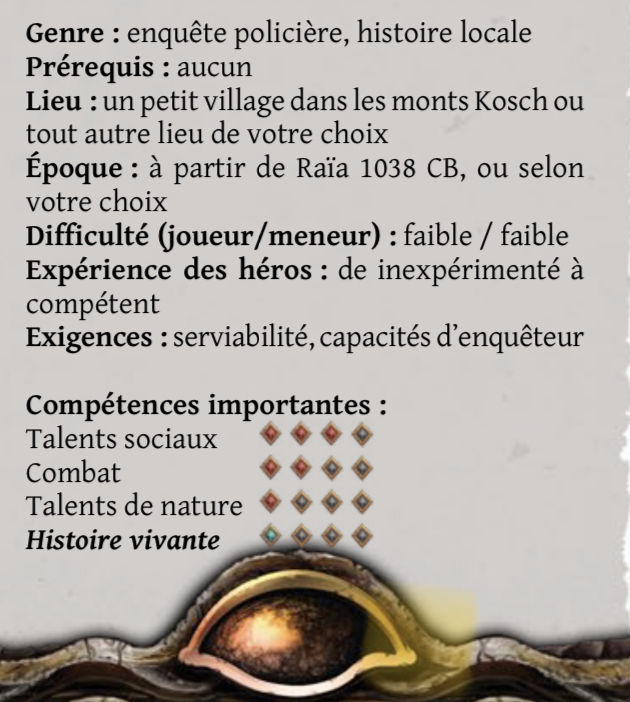 Sans être aussi exhaustive, voici la présentation des scénars dans Casus Belli, tous ont ce type de grille de 0 à 3 étoiles: