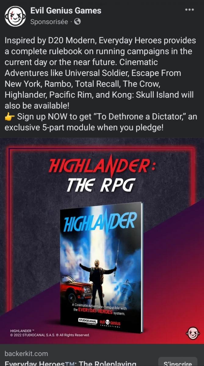visiblement c'est du "D20 moderne" avec 18 classes et une centaine de professions et cela propose des suppléments rattachés à des franchises de cinéma (Pacific Rim, Kong: Skull Island, Highlander, Escape From New York, The Crow, Total Recall, Rambo, and Universal Soldier)...