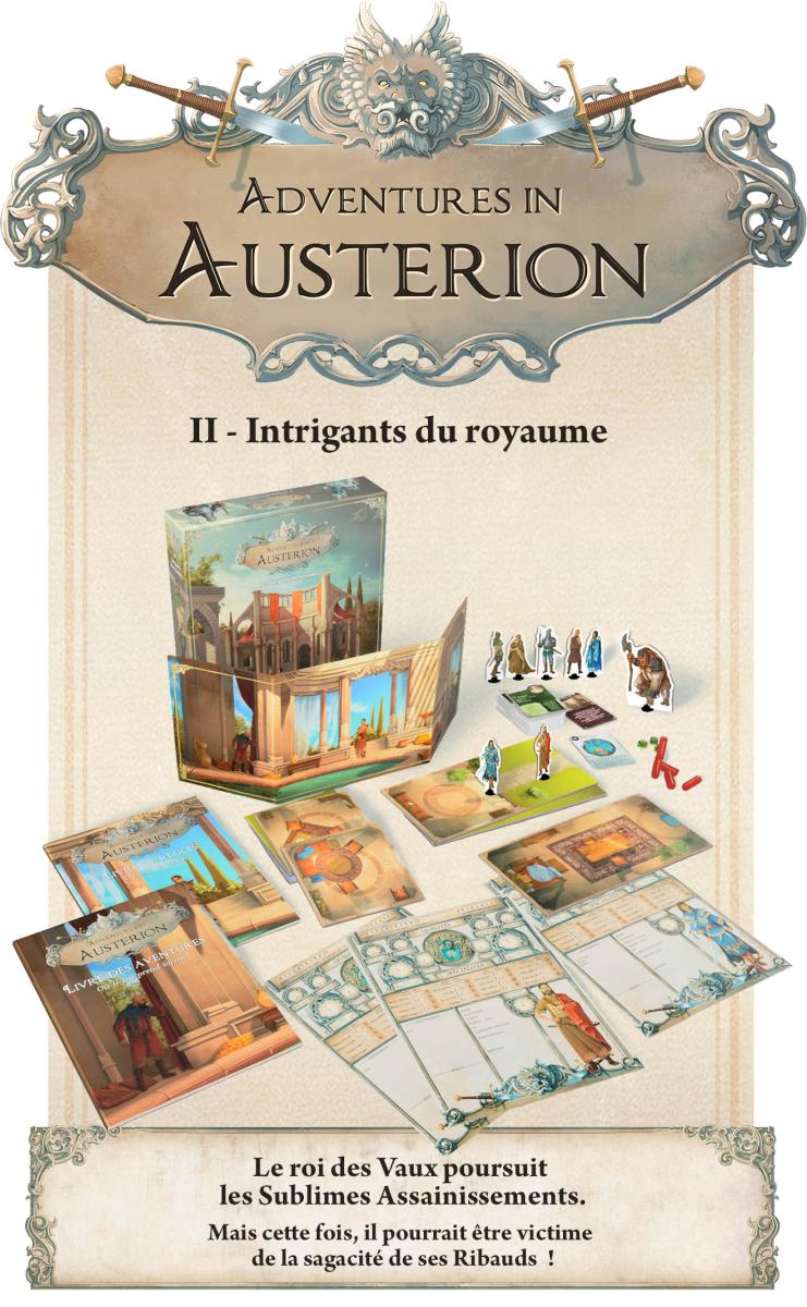 Les Intrigants du royaume vous plongera dans une enquête suite à des disparitions d’enfants dans la capitale de Valchêne et ses alentours. Les scénarios sont développés pour être joués en campagne qui conduira les joueurs à explorer divers environnements, extérieurs comme intérieurs, afin de remonter aux origines du pouvoir en Austerion ! Alors, êtes-vous prêts pour l’aventure ?