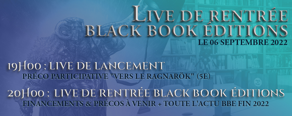 - 20h00 : live de rentrée avec Tony, Marc et Laura : venez découvrir toute l'actu brûlante de Black Book Editions et de Rôle'n Play jusqu'à la fin de l'année 2022 : les précommandes participatives et les précos classiques prévues d'ici la fin de l'année (accrochez-vous, on va vous en révéler une belle !), les sorties de nouveautés prévues à temps pour les fêtes, l'actualité du Black Book Shop (avec une belle annonce pour tous les gens de la métropole de Lyon !), les surprises à attendre du nouveau financement de Rôle'n Play, et plus encore !
