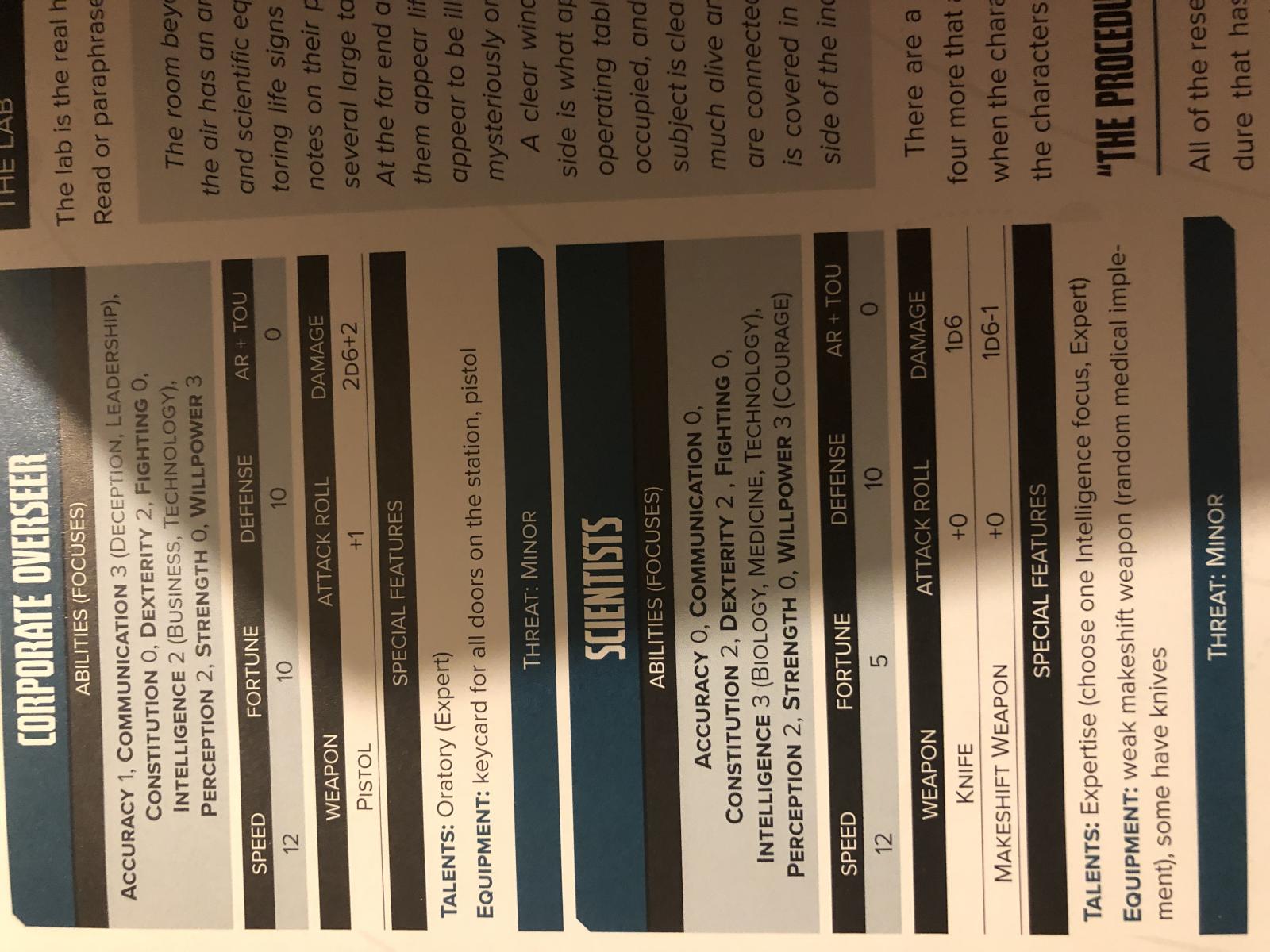 Bonjour, il doit y avoir une erreur page 250 du livre de règles (version papier et pdf) : dans le bloc de stats, les scientifiques ont les mêmes attributs (compétences) que le personnel de sécurité de la station page 248 :