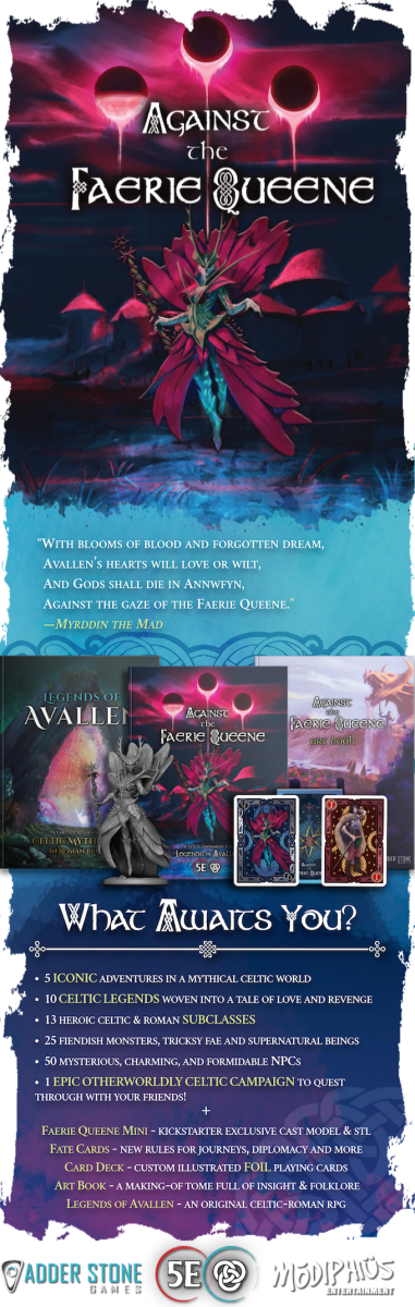 La campagne de financement en cours est pour Against the Faerie Queene qui est une campagne celtique pour 5E et Legends of Avallen, inspiré de véritables mythes celtiques de sombres histoires de fées et d'actes héroïques.