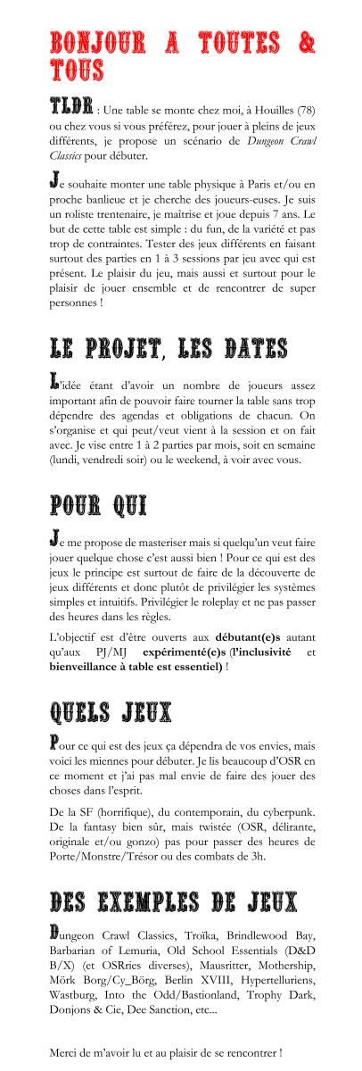 Bonjour , essayant depuis peu les jeux D&D avec mon frère ( age 32 et 37 ) nous recherchons une équipe pour des parties ( nous sommes clairement des novices ) mais connaissons les règles de base