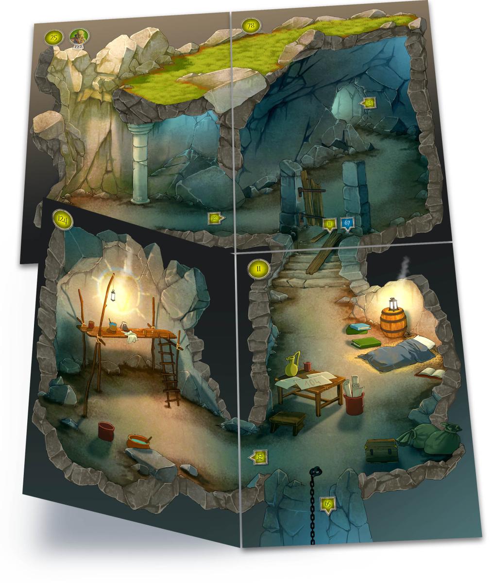 J'en profite pour vous dévoiler les tuiles du jeu. Il y aura au moins 30 lieux différents dans le jeu, avec des salles qui changeront en fonction de vos choix dans l'aventure. Différence par rapport à Brumes, ici les salles se mettent cote à cote. Les icones, couleurs et flèches vous permettront de naviguer suivant les choix d'aventures que vous aurez fait content