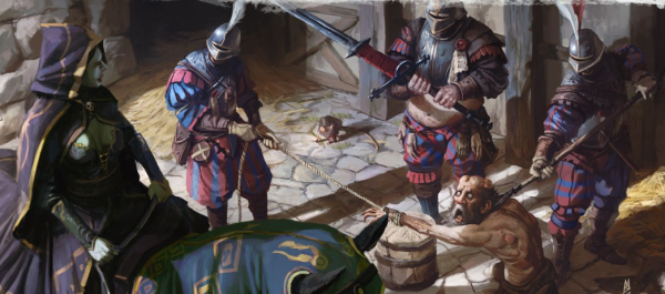 Grossière erreur, les gardes étaient là et ils nous attendaient arbalète en main. Leur chef, portant un masque en argent de mauvais goût, nous intime un choix : nous rendre ou mourir. Nous lâchons nos armes. Sigmar nous viendra en aide, j'en suis persuadé.