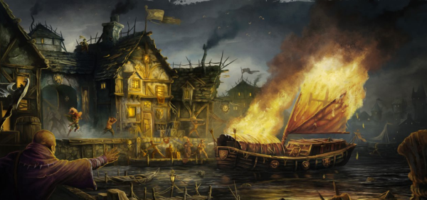 En fin de journée, nous arrivons à Kemperbad pour une pause bien méritée. Dans l'auberge près des docks, un homme nous hurle dessus. C'est cet abruti Oldenhaller qui vient faire son commerce ici. Il paye nos boissons mais nous assommes de jérémiades. Waltram sort une lettre de sa veste, lettre subtilisée à l'étude de feu Margritte Wittgenstein. L'expéditeur est son frère Gottard qui dit avoir quitté le fief familial pour s'installer à Middenheim. Il déclare s'y amuser comme un petit fou. Baragaz souligne que c'est un adorateur de Slaanesh, ce qui est assez pour que je veuille aller immédiatement à Middenheim. Anders insiste aussi sur son envie d'aller dans la cité du loup blanc. Il transporte avec lui un vieux parchemin miteux, une prophétie venue de Talabheim et la dernière ligne déclare : "A Middenheim, vous irez voir l'ancien". Nous hochons tous de la tête, décidés et choppe en main quand Max Oldenhaller pointe par la fenêtre et dit : "C'EST PAS VOTRE BATEAU QUI BRULE, LA ?"